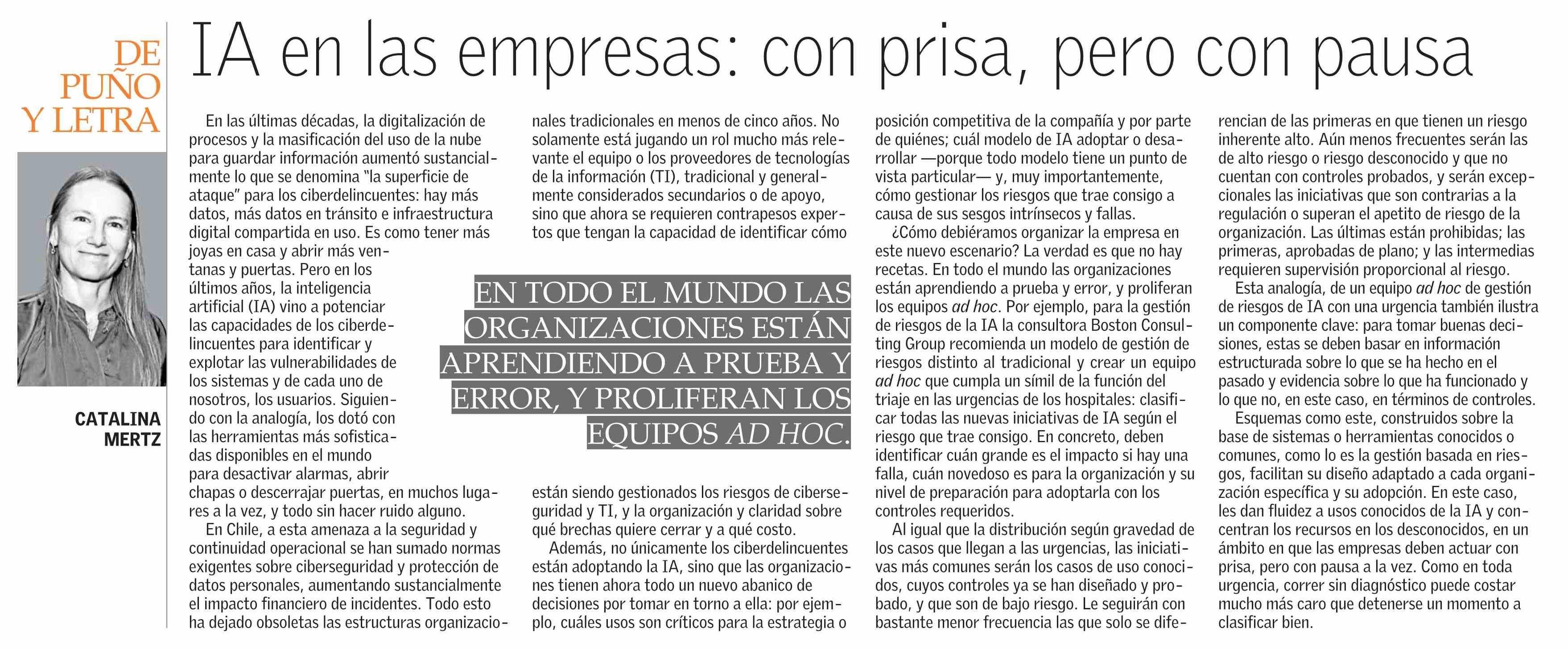 Columnas de Opinión: IA en las empresas: con prisa, pero con pausa 15-04-2026 El Mercurio |