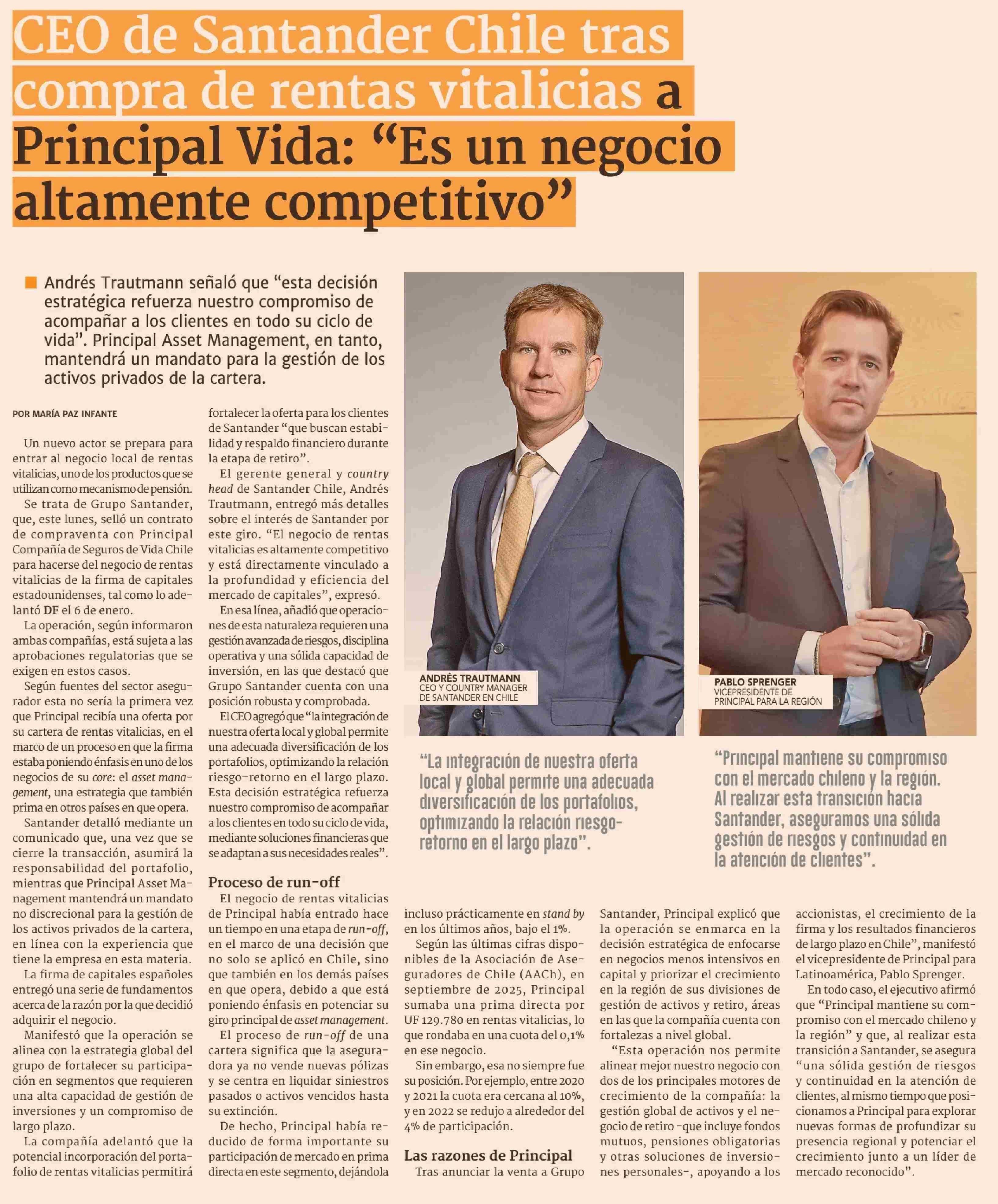 CEO de Santander Chile tras compra de rentas vitalicias a Principal Vida: "Es un negocio altamente competitivo" 20-01-2026 Diario Financiero |