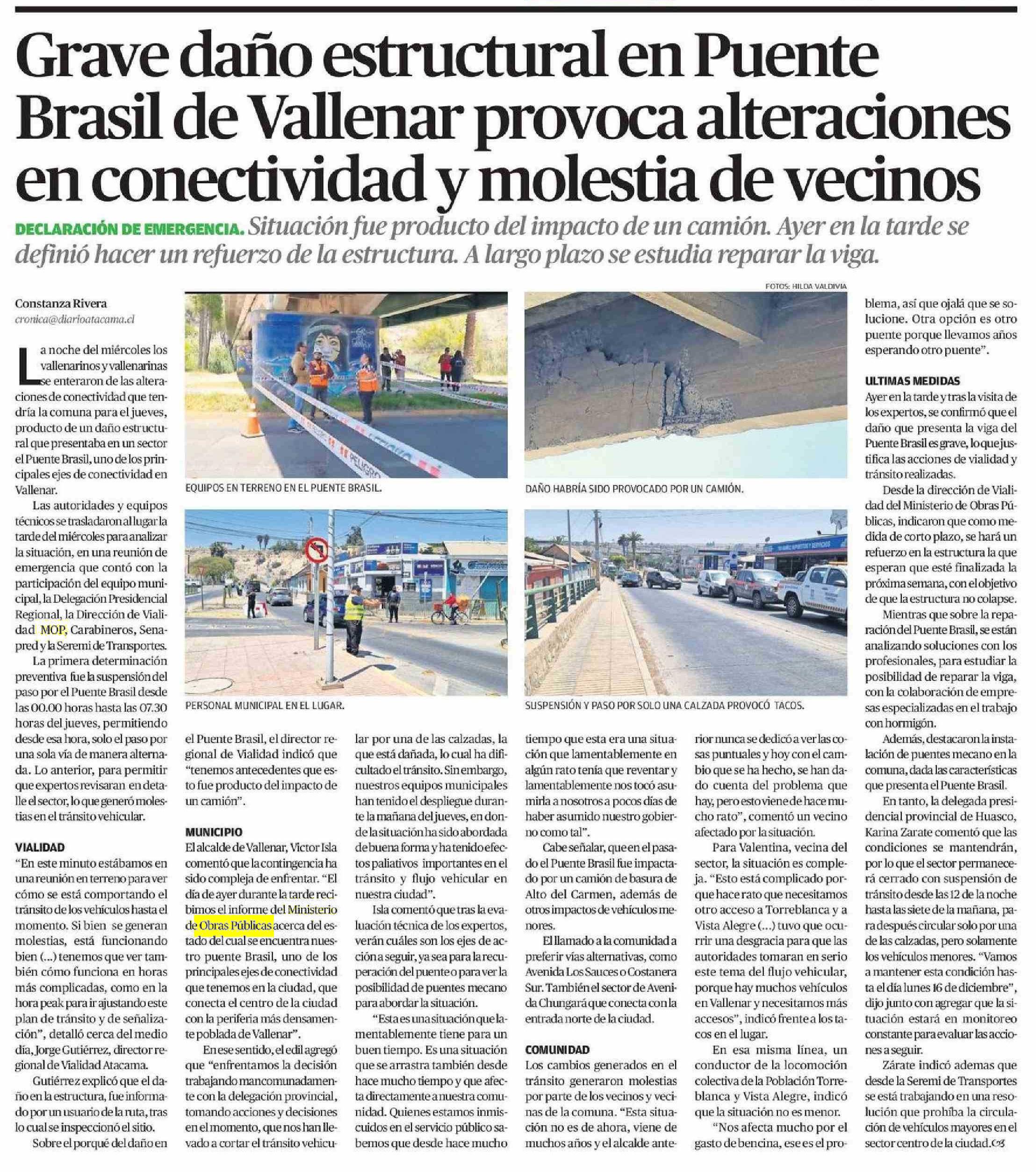 Grave daño estructural en Puente Brasil de Vallenar provoca alteraciones en conectividad y molestia de vecinos 13-12-2024 El Diario de Atacama |