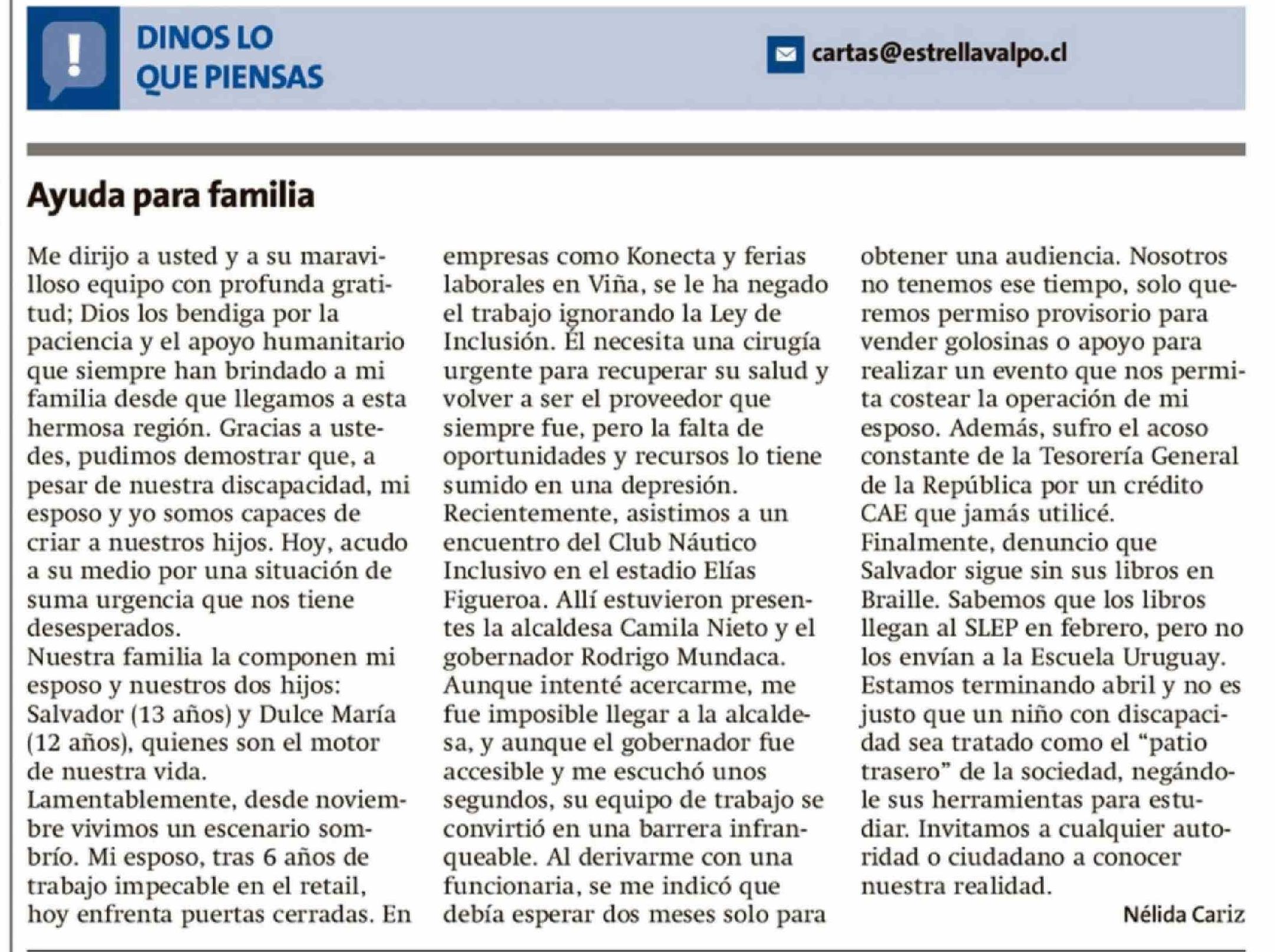 Cartas: Ayuda para familia 25-04-2026 La Estrella de Valparaíso |