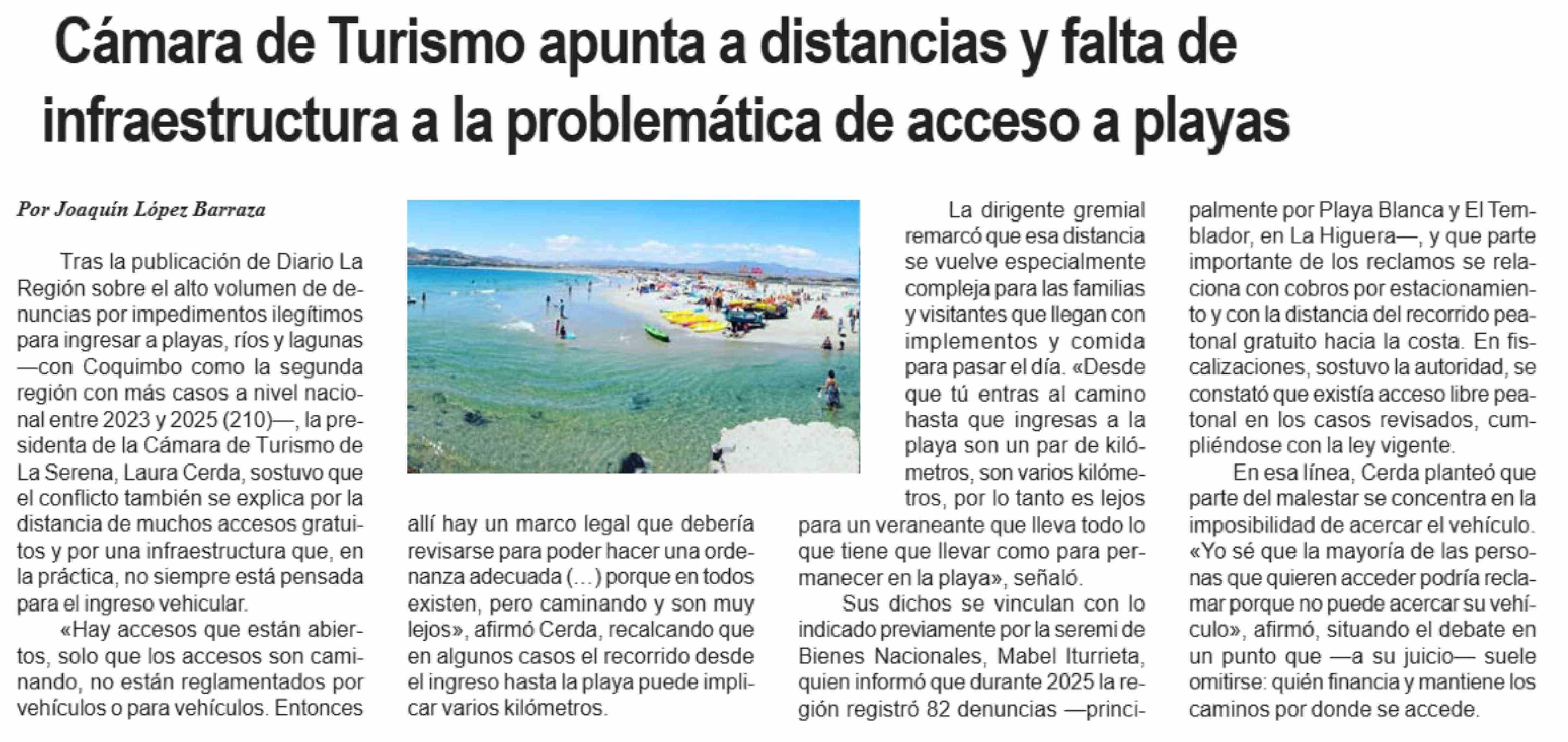 Cámara de Turismo apunta a distancias y falta de infraestructura a la problemática de acceso a playas 31-01-2026 Diario la Región |
