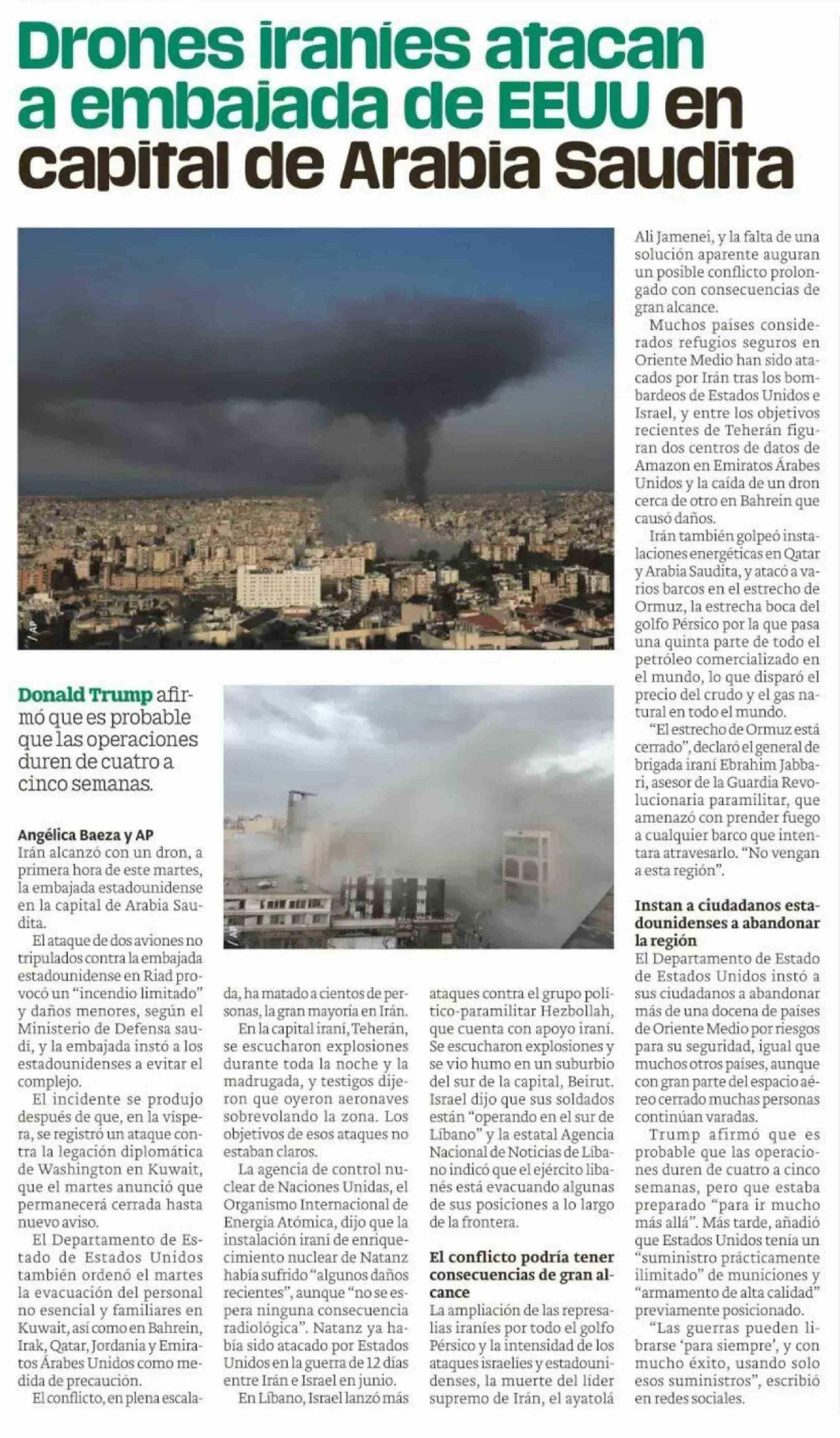 Drones iranies atacan a embajada de EEUU en capital de Arabia Saudita 04-03-2026 Publimetro |