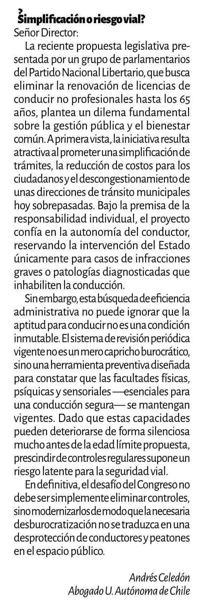 | Título: | Cartas: ¿Simplificación o riesgo vial? Señor Director: La reciente propuesta legislativa presentada por un grupo de parlamentarios del Partido Nacional Libertario, que busca eliminar la renovación de licencias de conducir no profesionales hasta los 65 años, plantea un dilema fundamental sobre la ges |