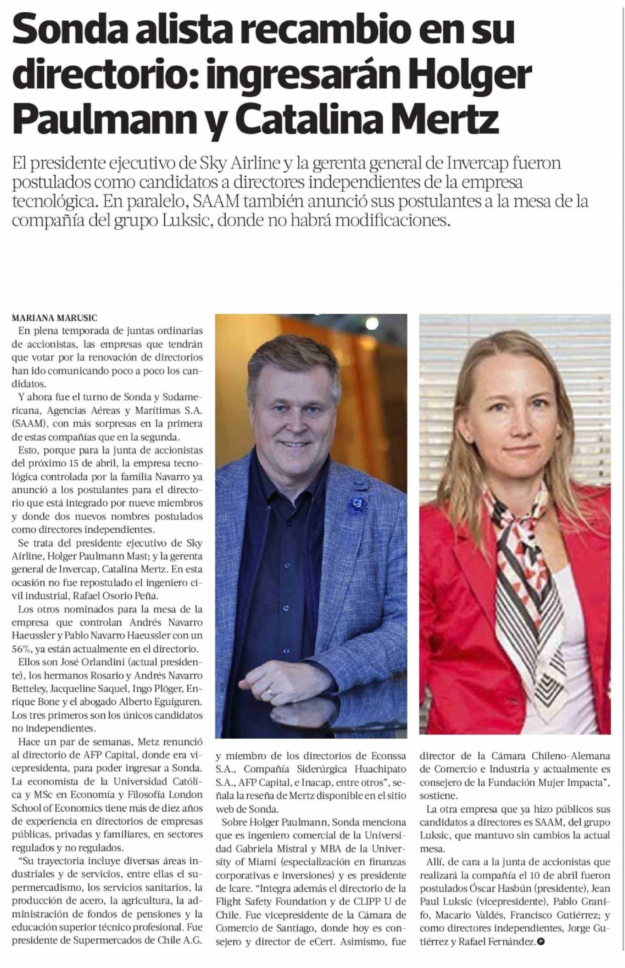 Sonda alista recambio en su directorio: ingresarán Holger Paulmann y Catalina Mertz 09-04-2026 La Tercera |
