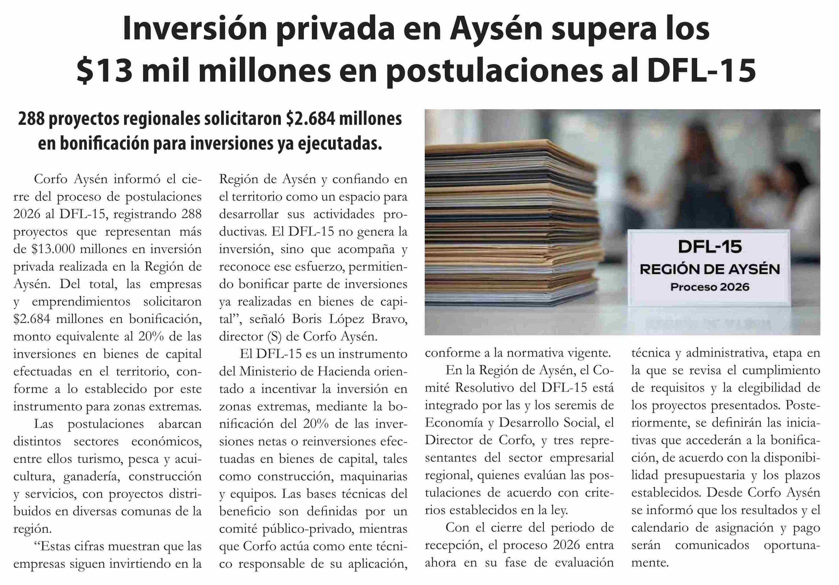 | Título: | Inversión privada en Aysén supera los $13 mil millones en postulaciones al DFL-15 |