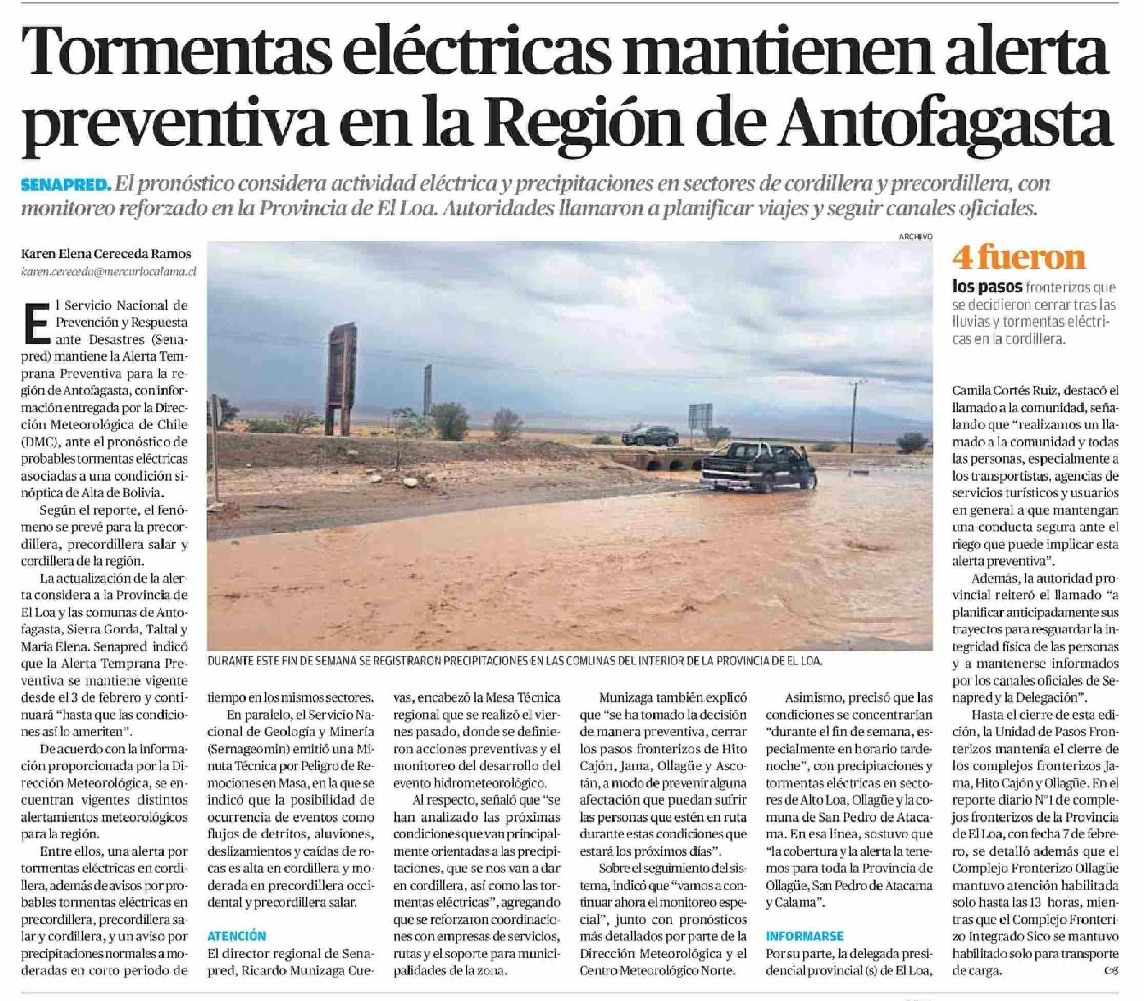 Tormentas eléctricas mantienen alerta preventiva en la Región de Antofagasta 08-02-2026 El Mercurio de Calama |