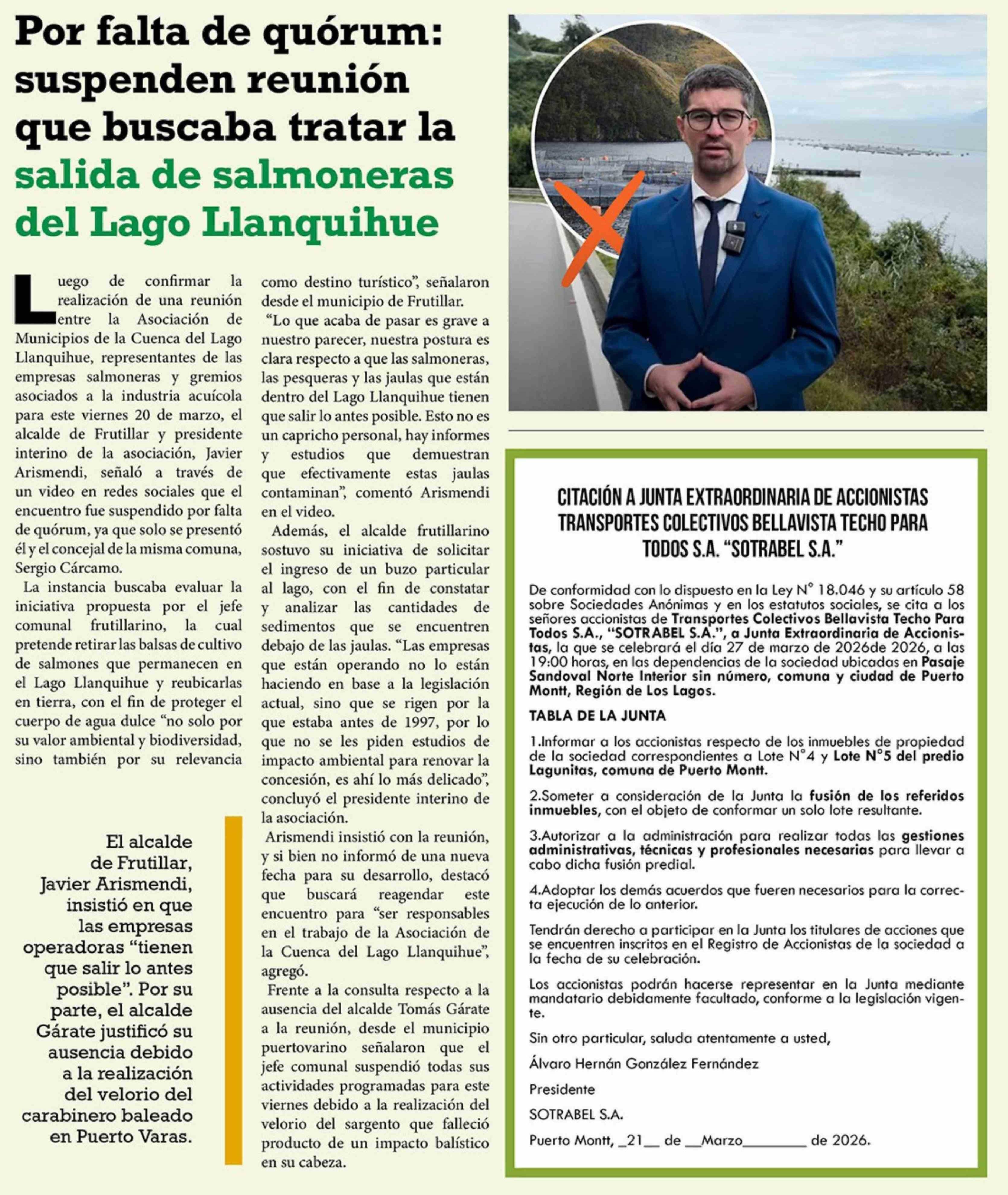 Por falta de quórum: suspenden reunión que buscaba tratar la salida de salmoneras del Lago Llanquihue 21-03-2026 El Heraldo Austral |