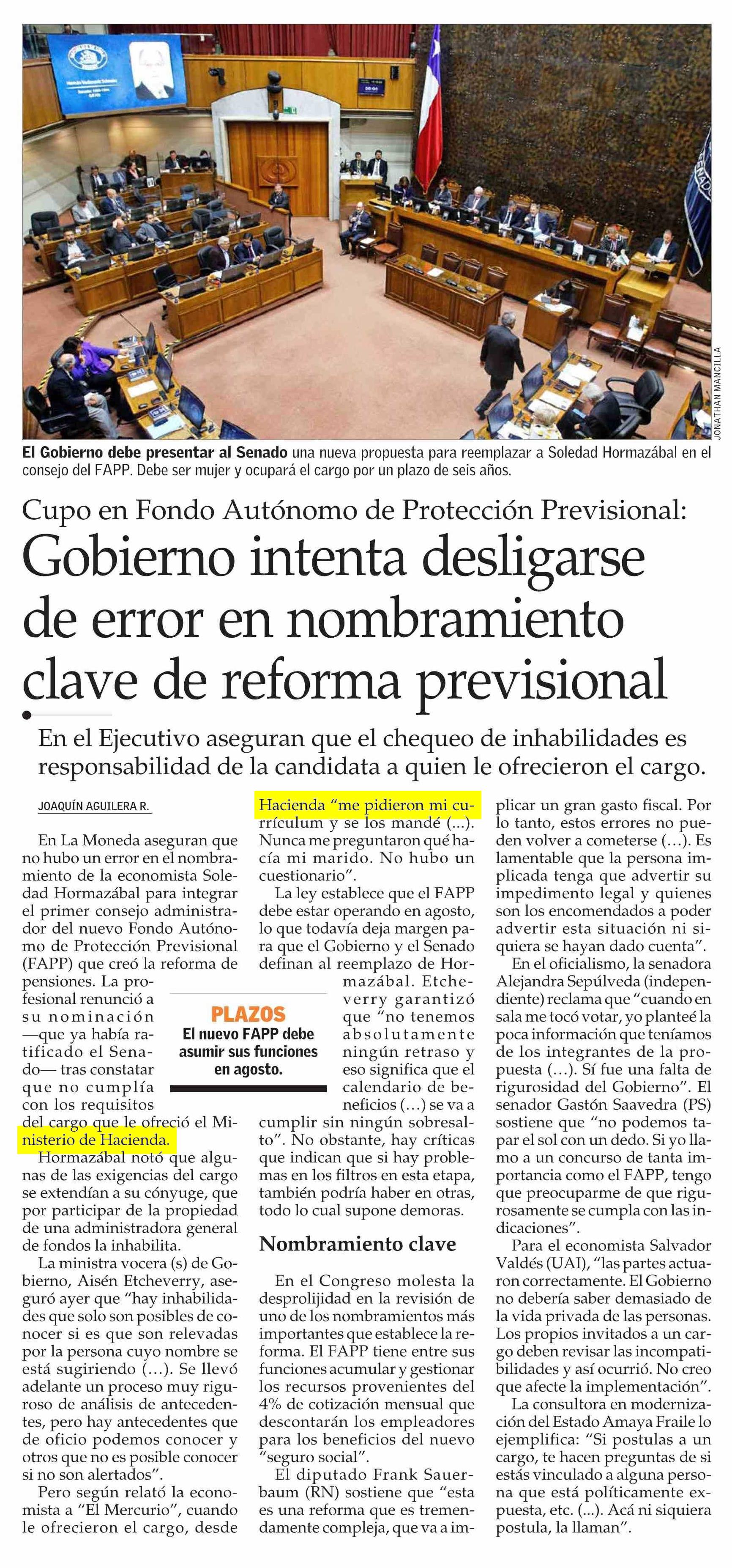 Gobierno intenta desligarse de error en nombramiento clave de reforma previsional 10-06-2025 El Mercurio |