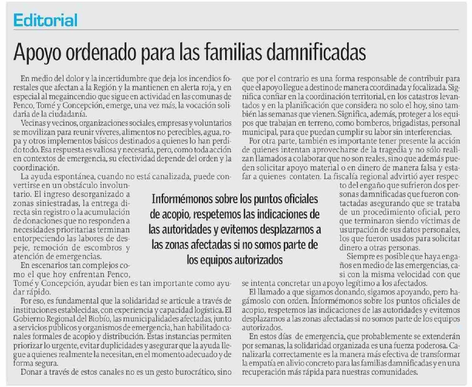 Editorial: Apoyo ordenado para las familias damnificadas 20-01-2026 El Sur |