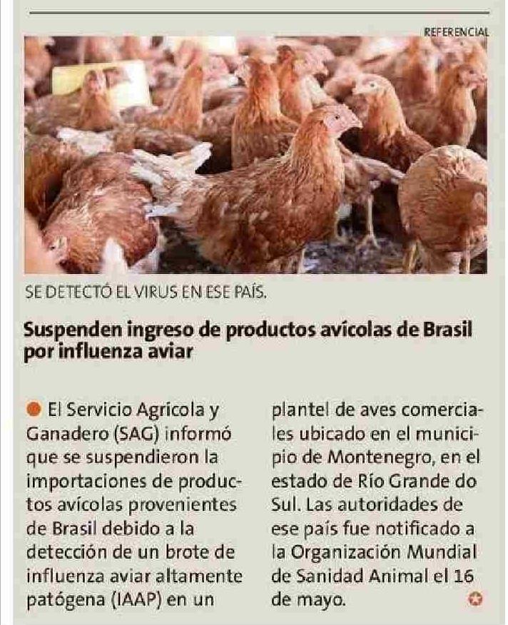 | Título: | Suspenden ingreso de productos avícolas de Brasil por influenza aviar |