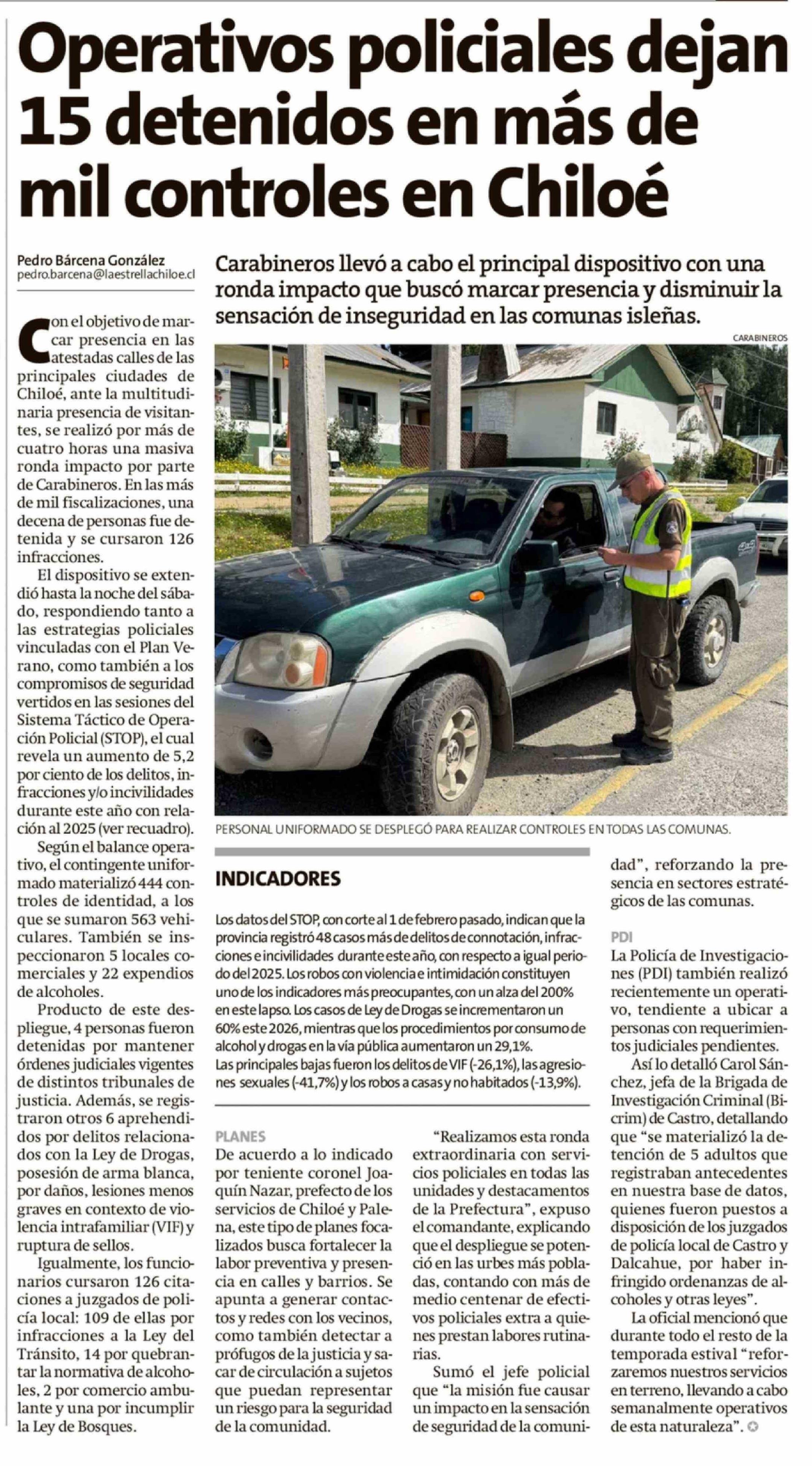 Operativos policiales dejan 15 detenidos en más de mil controles en Chiloé 16-02-2026 La Estrella de Chiloé |