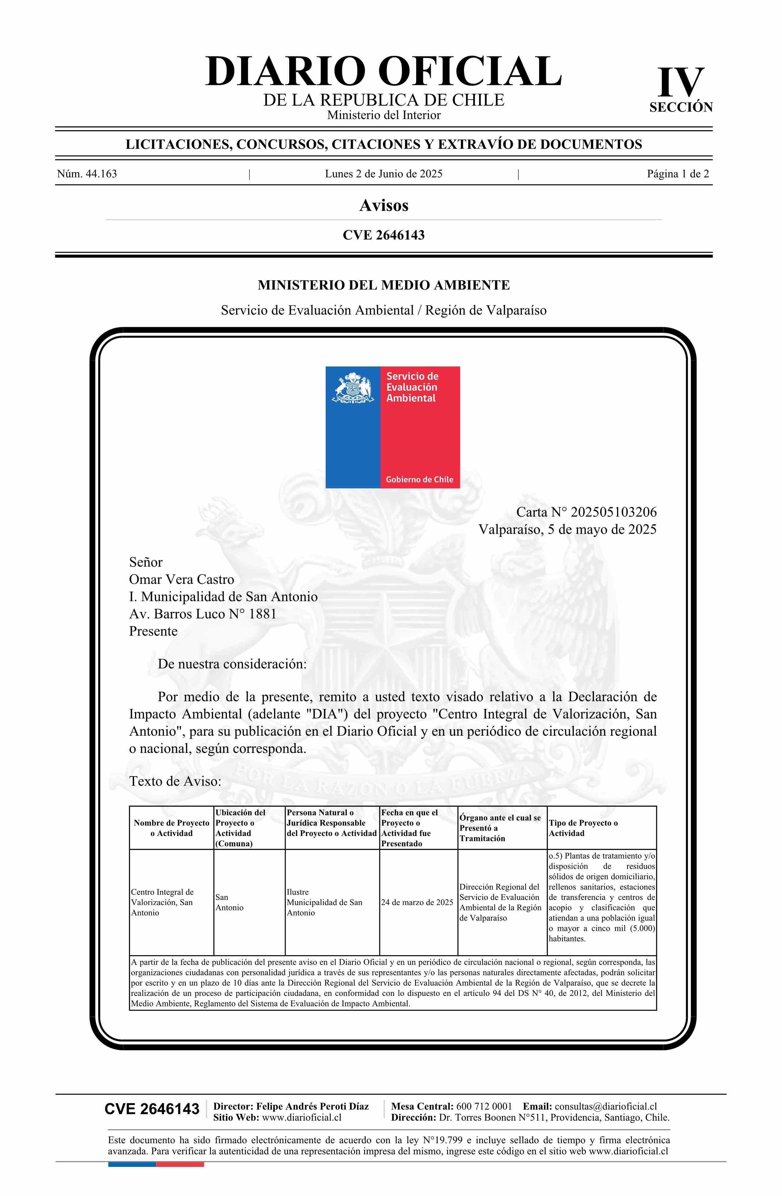 AVISO LICITACIONES: Lista de proyecto o actividad sujeto a Declaración de Impacto Ambiental 02-06-2025 Diario Oficial Edición Electrónica |