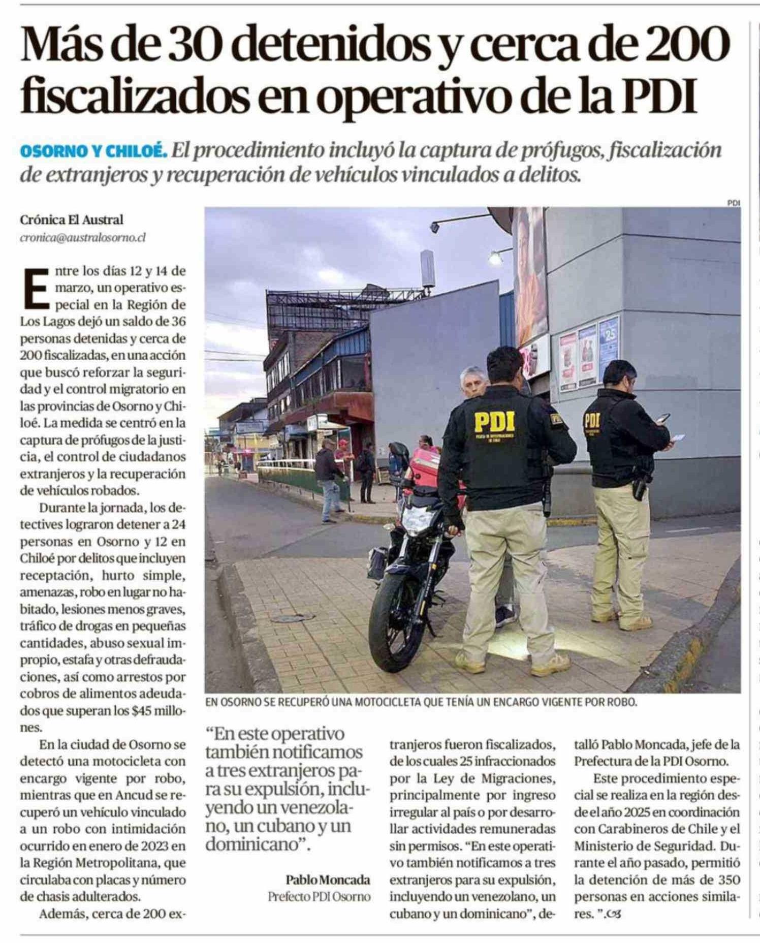 Más de 30 detenidos y cerca de 200 fiscalizados en operativo de la PDI 17-03-2026 El Austral de Osorno |