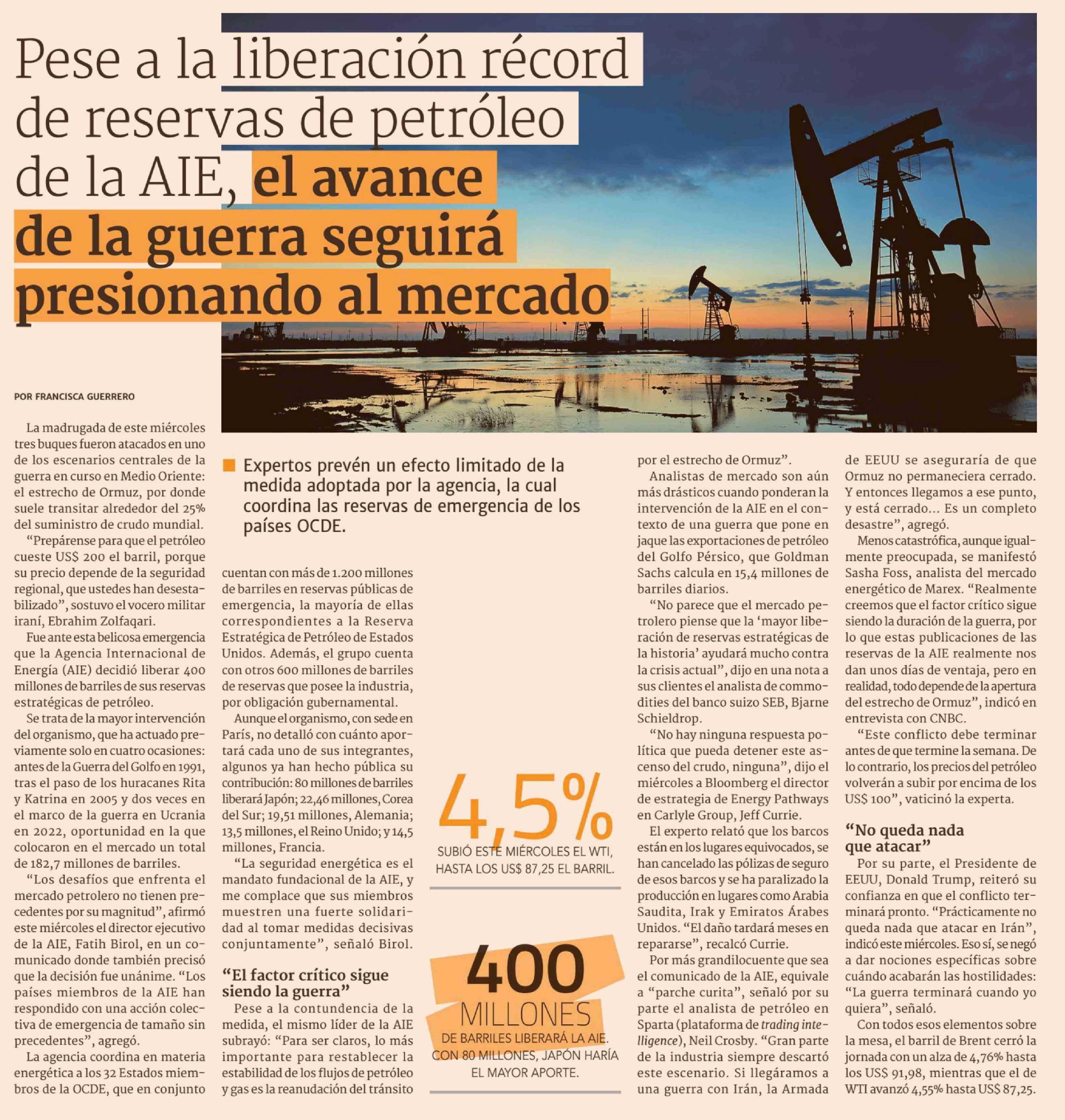 Pese a la liberación récord de reservas de petróleo de la AIE, el avance de la guerra seguirá presionando al mercado 12-03-2026 Diario Financiero |