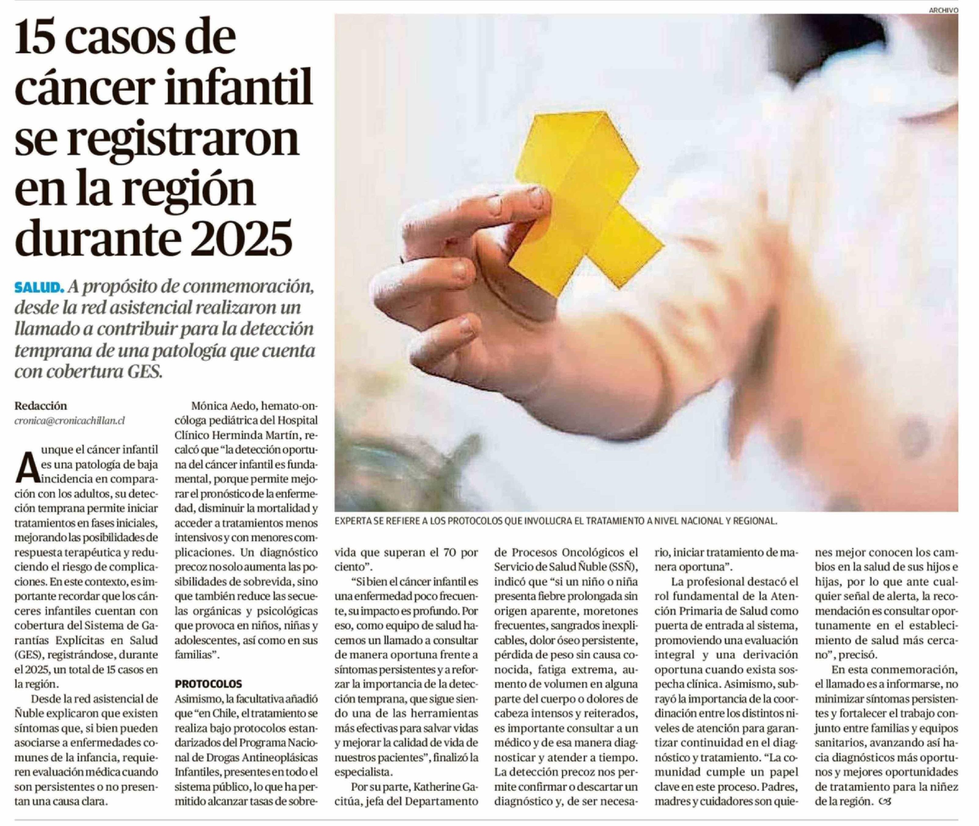 15 Casos de cáncer infantil se registraron en la región durante 2025 16-02-2026 Crónica de Chillán |