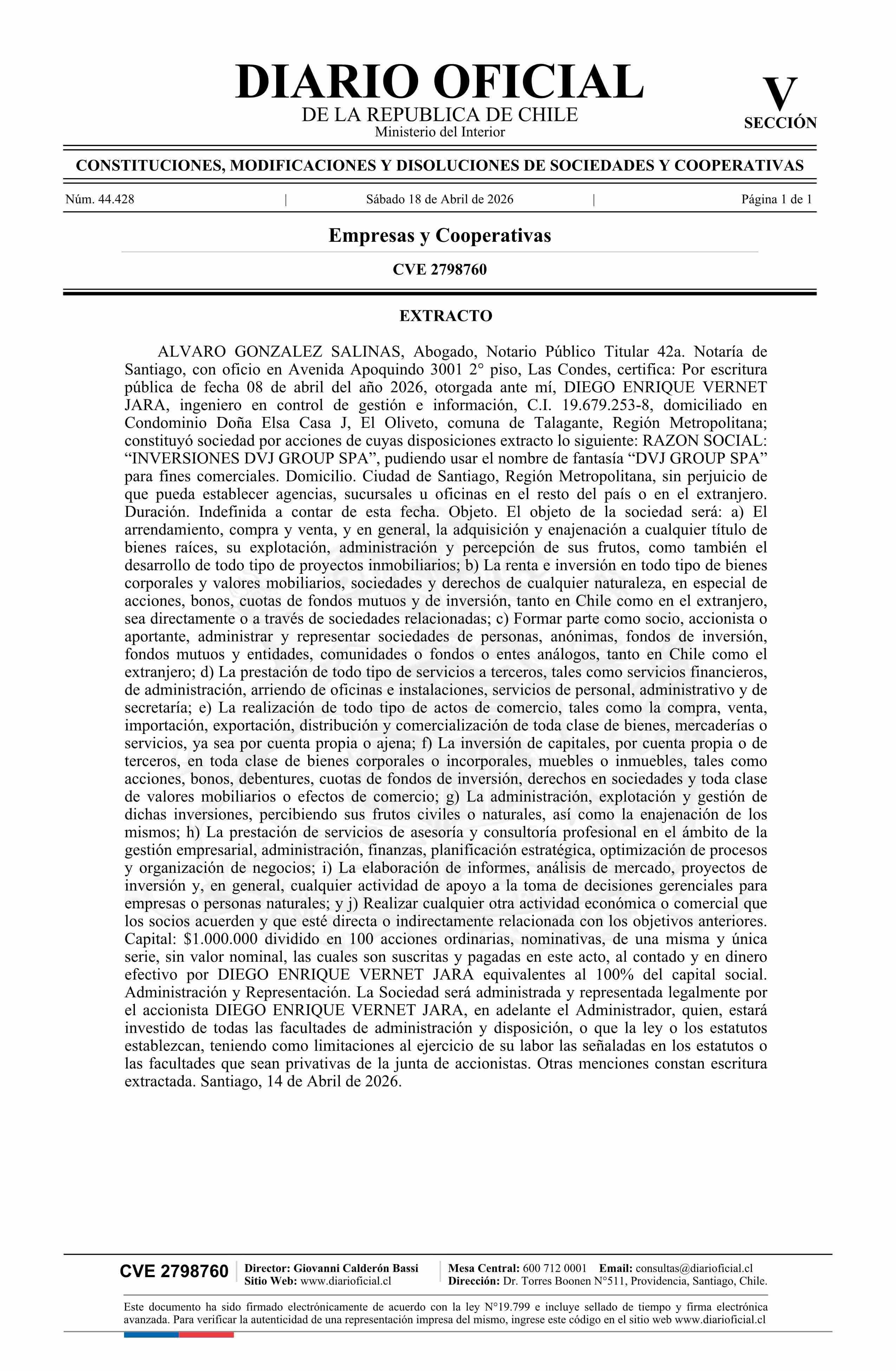 Inversiones DVJ Group SpA 18-04-2026 Diario Oficial Edición Electrónica |