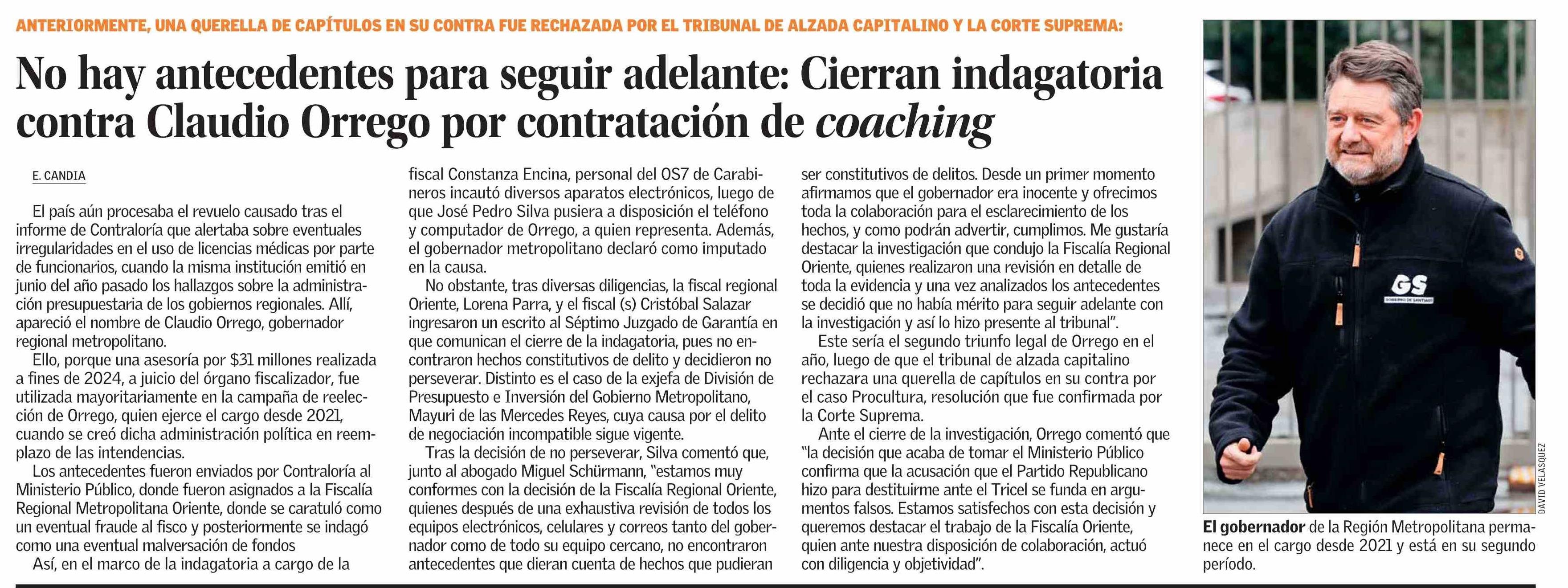 No hay antecedentes para seguir adelante: Cierran indagatoria contra Claudio Orrego por contratación de coaching 20-03-2026 El Mercurio |