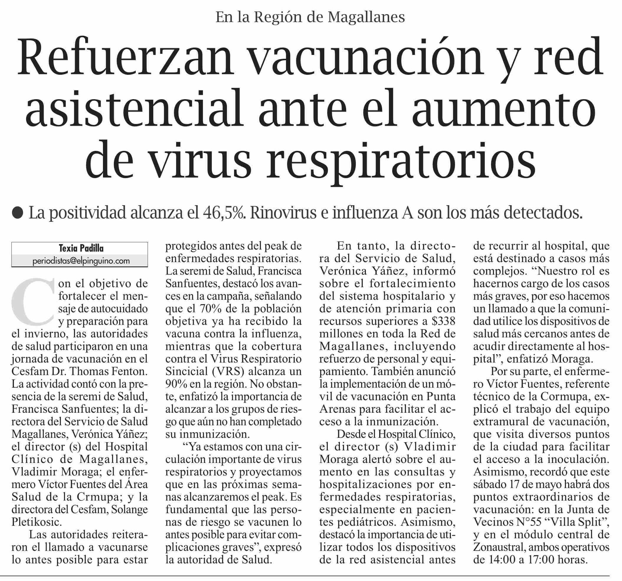 Refuerzan vacunación y red asistencial ante el aumento de virus respiratorios 17-05-2025 El Pingüino |