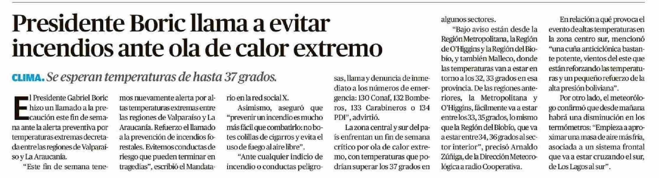 | Título: | Presidente Boric llama a evitar incendios ante ola de calor extremo |