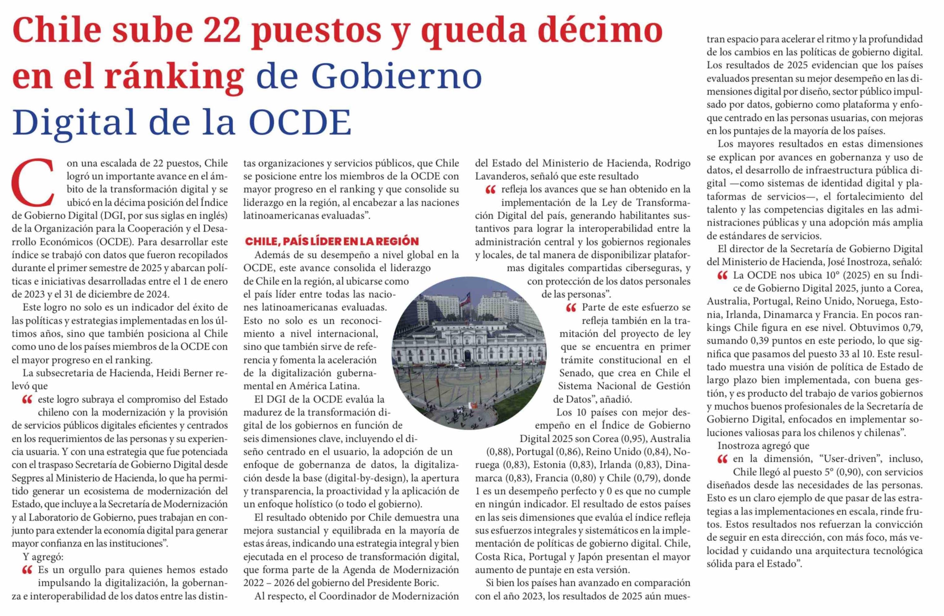 Chile sube 22 puestos y queda décimo en el ránking de Gobierno Digital de la OCDE 17-02-2026 Diario Chañarcillo |