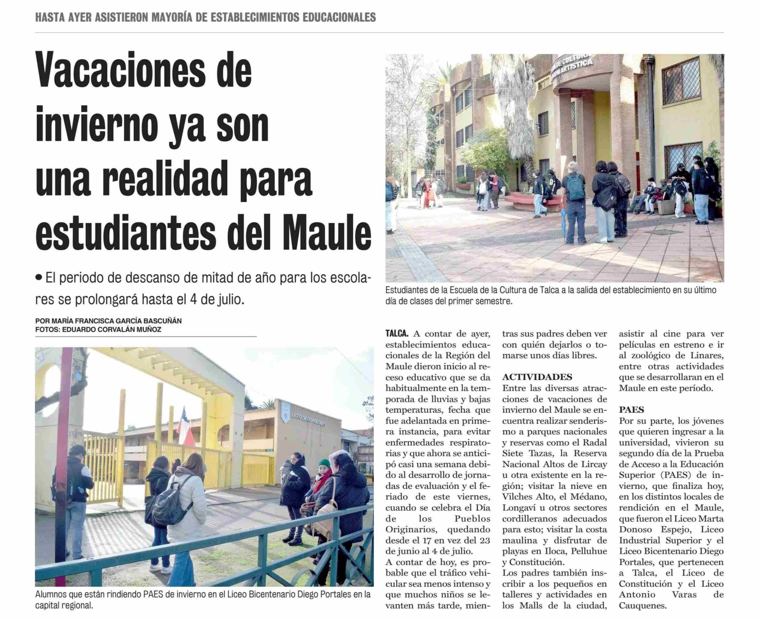 Vacaciones de invierno ya son una realidad para estudiantes del Maule 18-06-2025 La Prensa de Curicó |