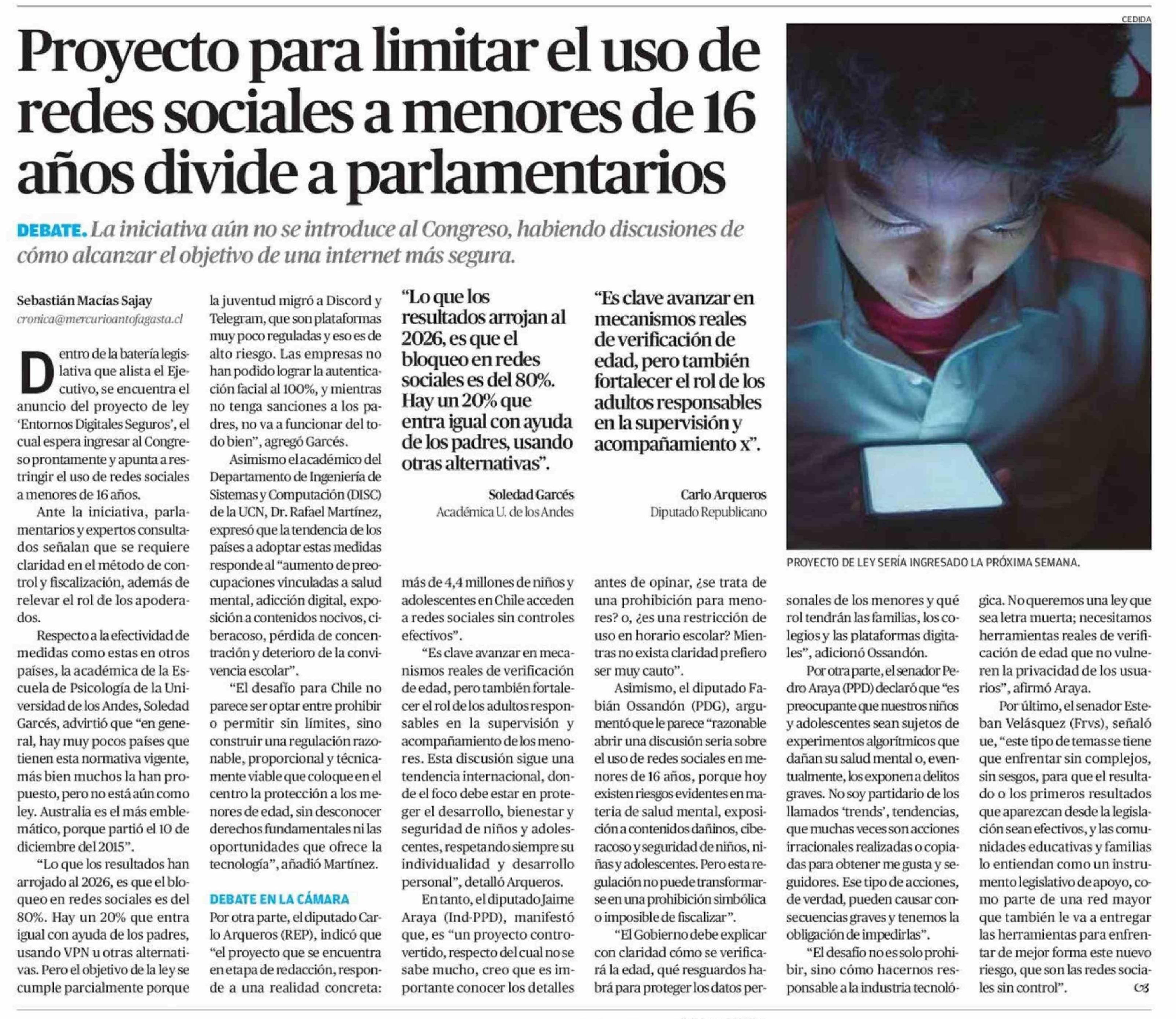 Proyecto para limitar el uso de redes sociales a menores de 16 años divide a parlamentarios 29-04-2026 El Mercurio de Calama |