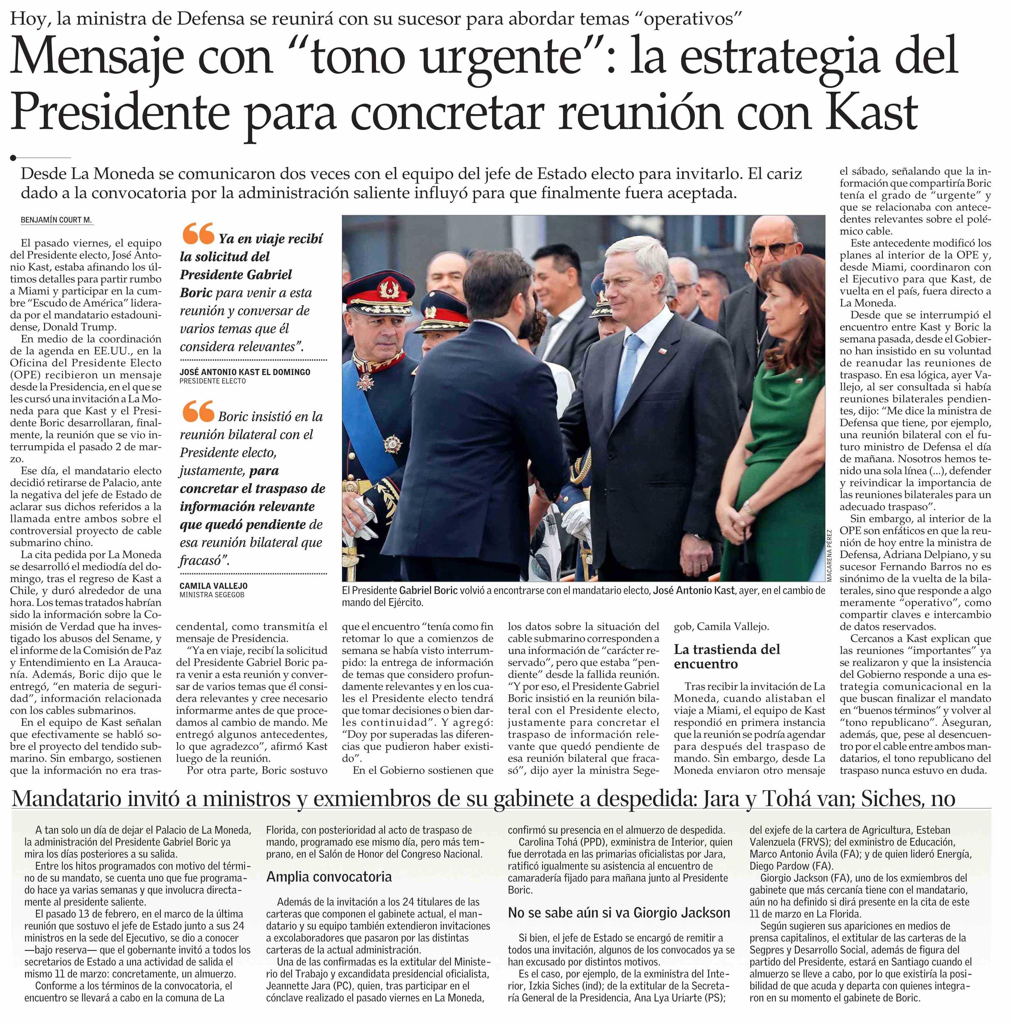 Mensaje con “tono urgente”: la estrategia del Presidente para concretar reunión con Kast 10-03-2026 El Mercurio |