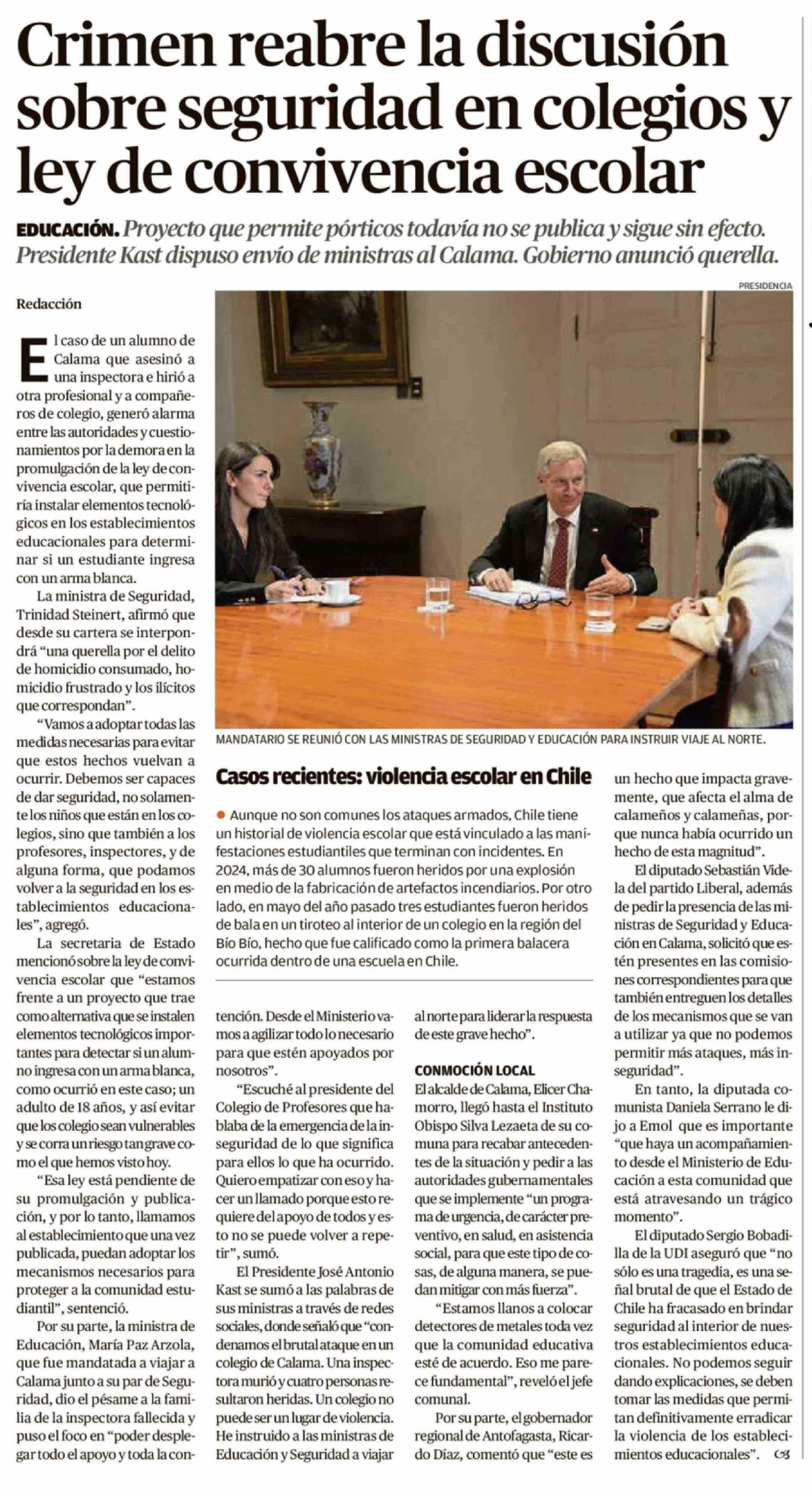 | Título: | Crimen reabre la discusión sobre seguridad en colegios y ley de convivencia escolar |