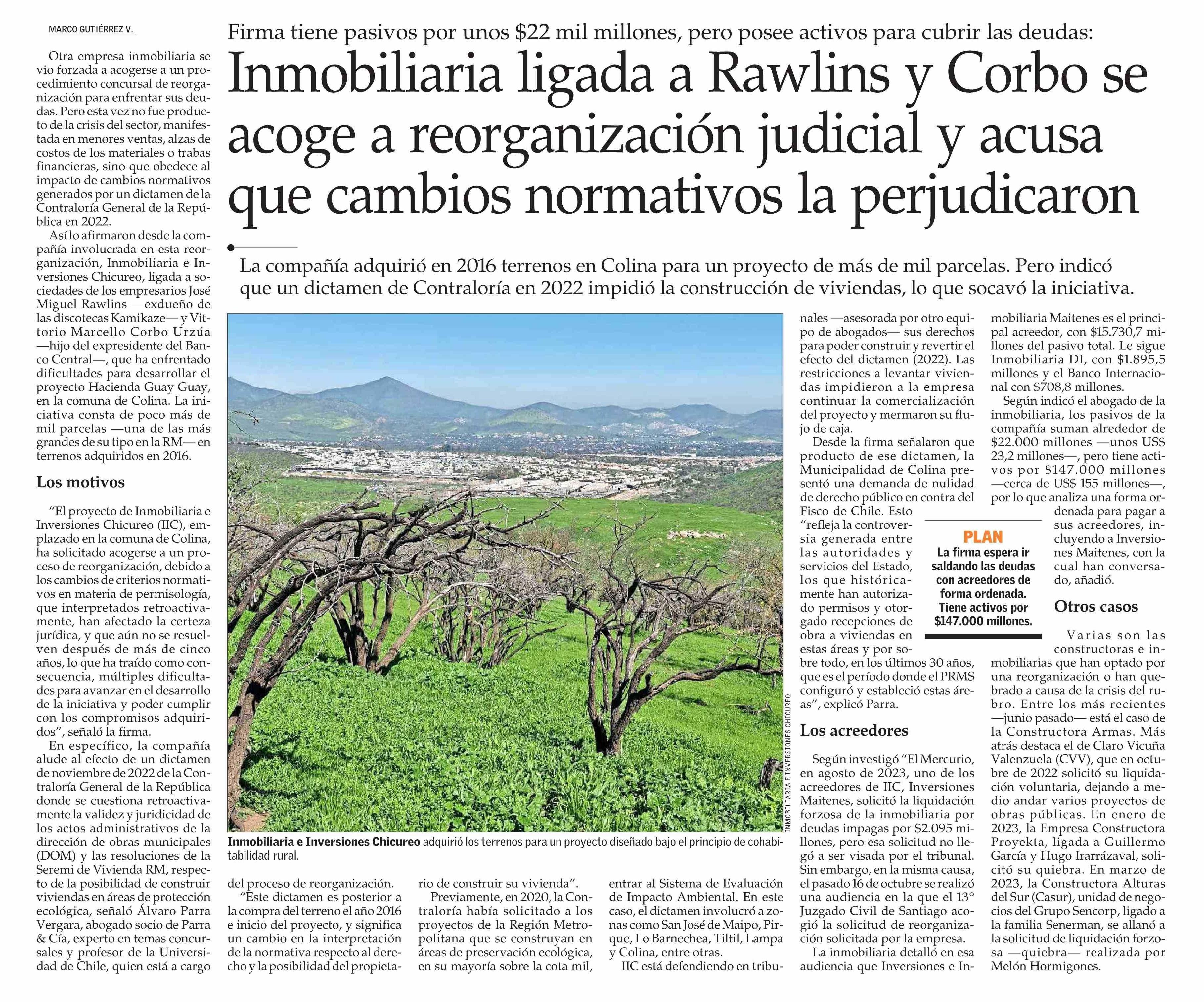 Título: Inmobiliaria ligada a Rawlins y Corbo se acoge a reorganización judicial y acusa que cambios normativos la perjudicaron