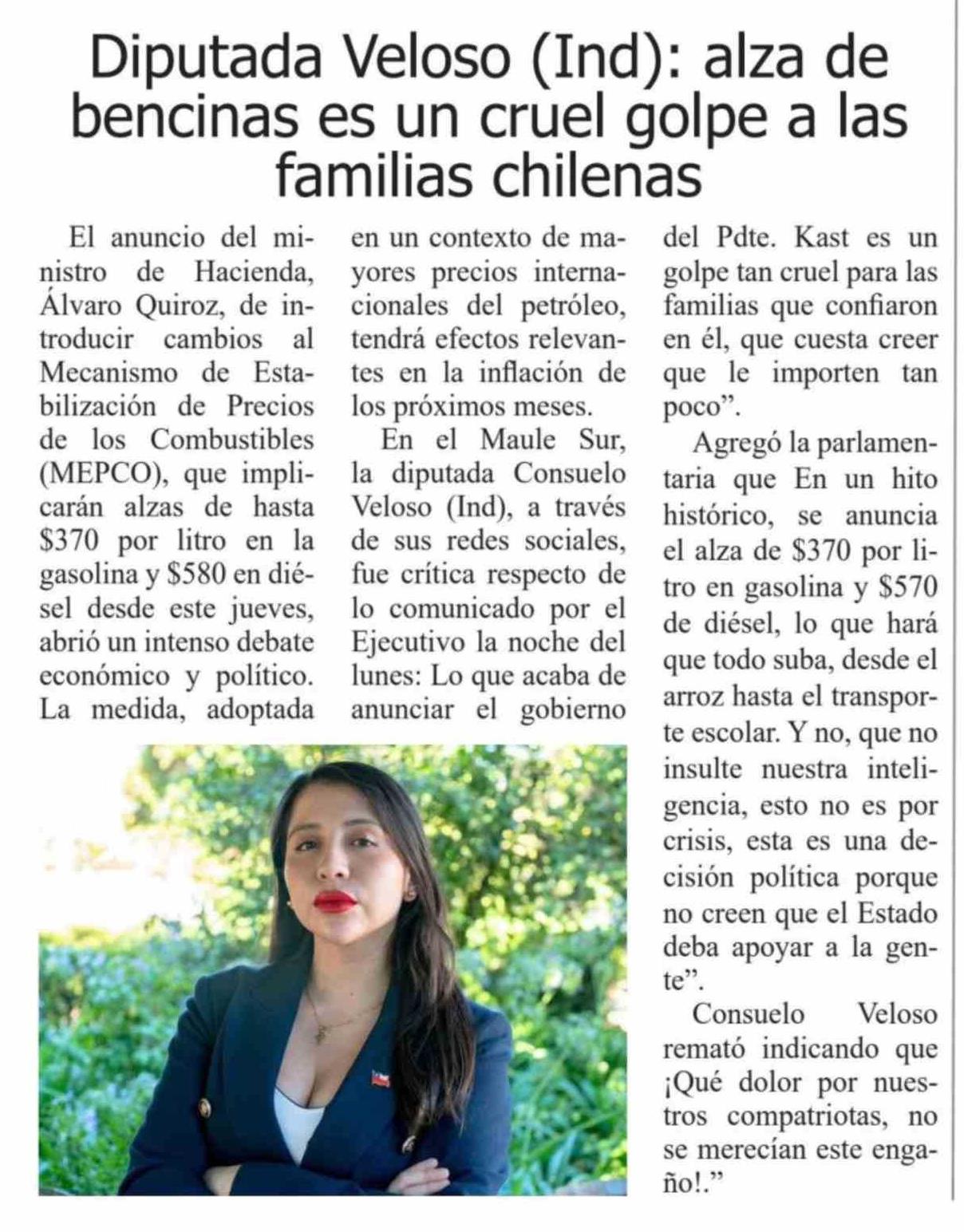 | Título: | Diputada Veloso (Ind): alza de bencinas es un cruel golpe a las familias chilenas |