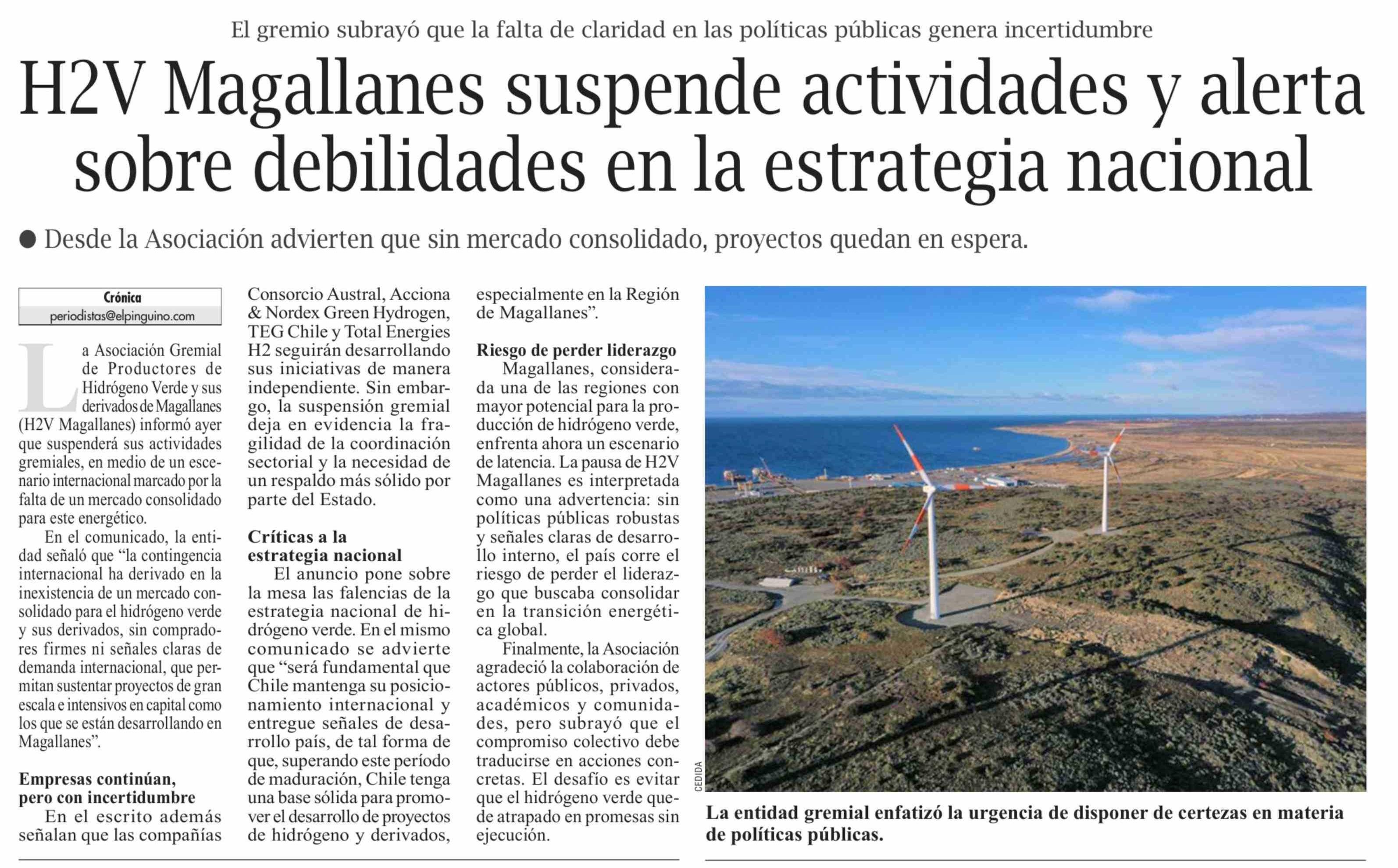 Título: H2V Magallanes suspende actividades y alerta sobre debilidades en la estrategia nacional