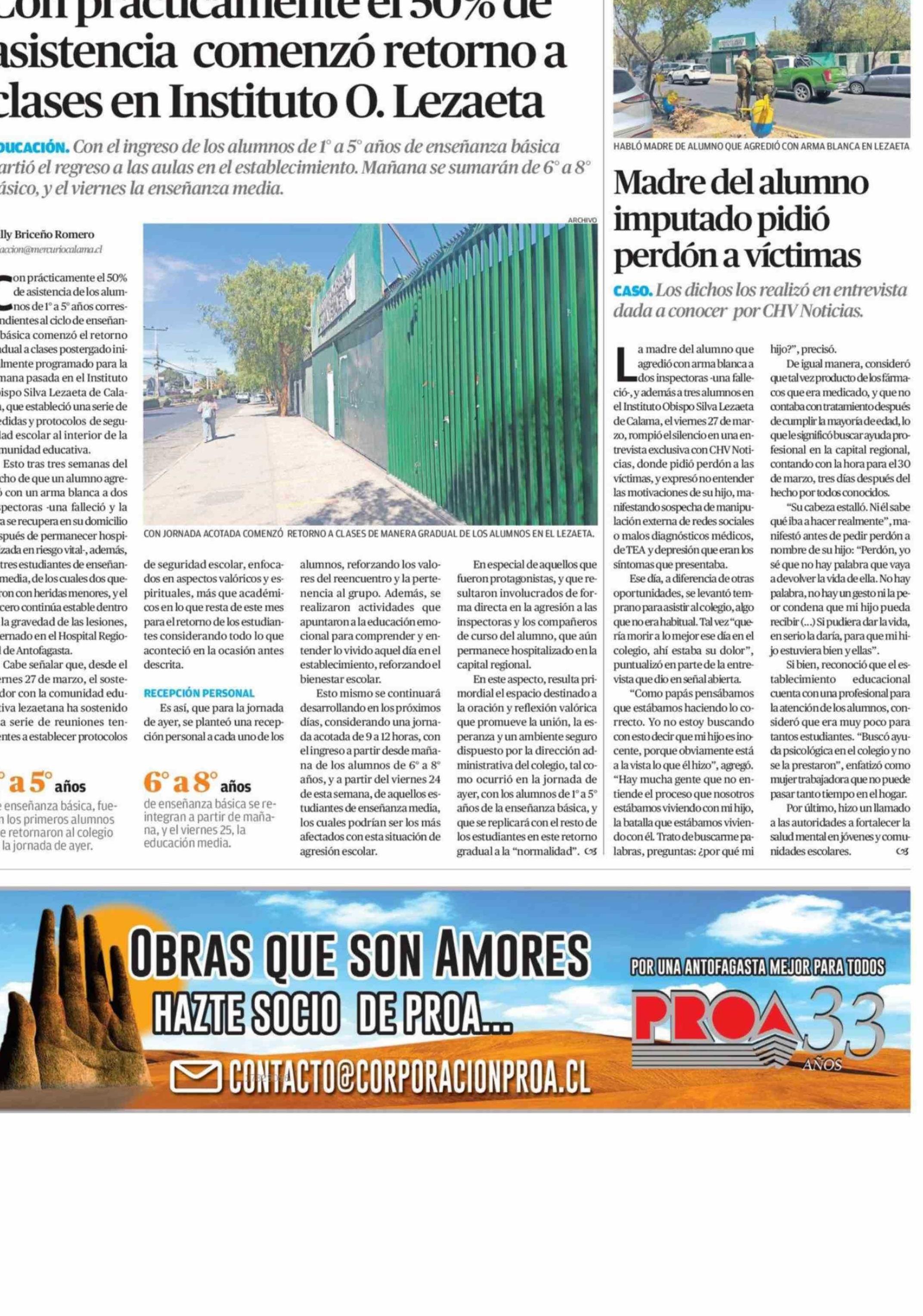 Con prácticamente el 50% de asistencia comenzó retorno a clases en Instituto O. Lezaeta 21-04-2026 El Mercurio de Antofagasta |