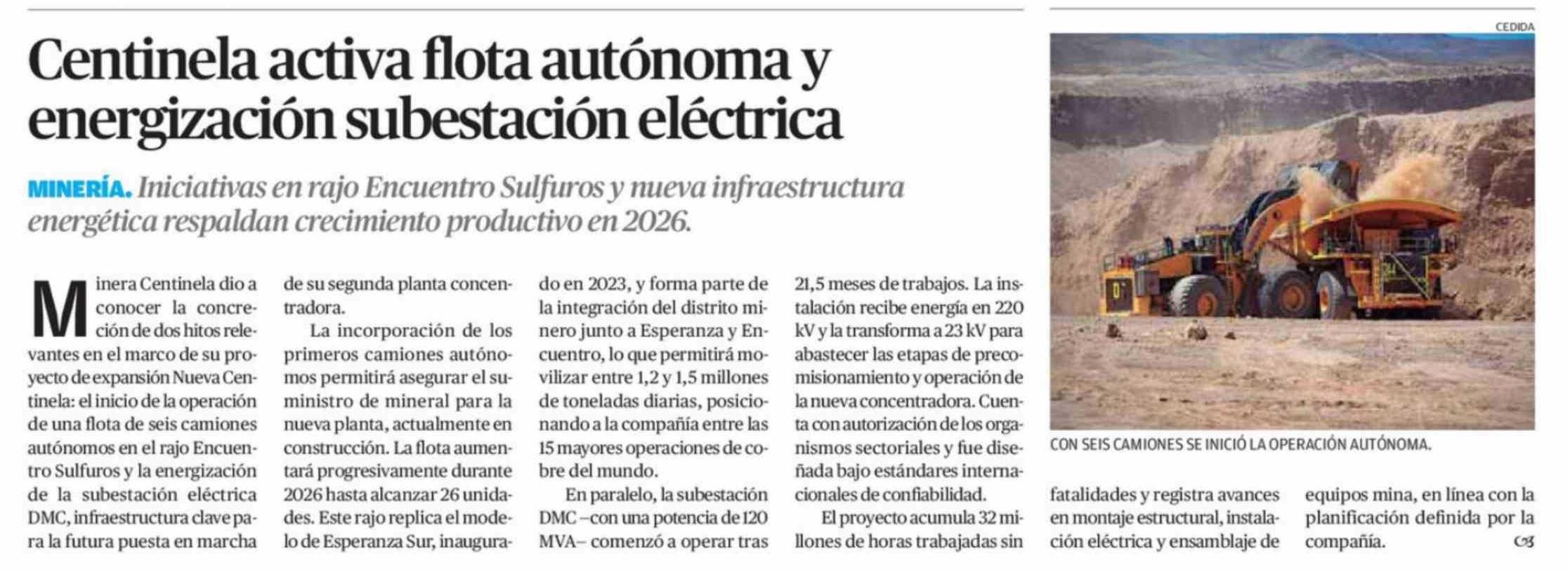 Centinela activa flota autónoma y energización subestación eléctrica 12-02-2026 El Mercurio de Calama |