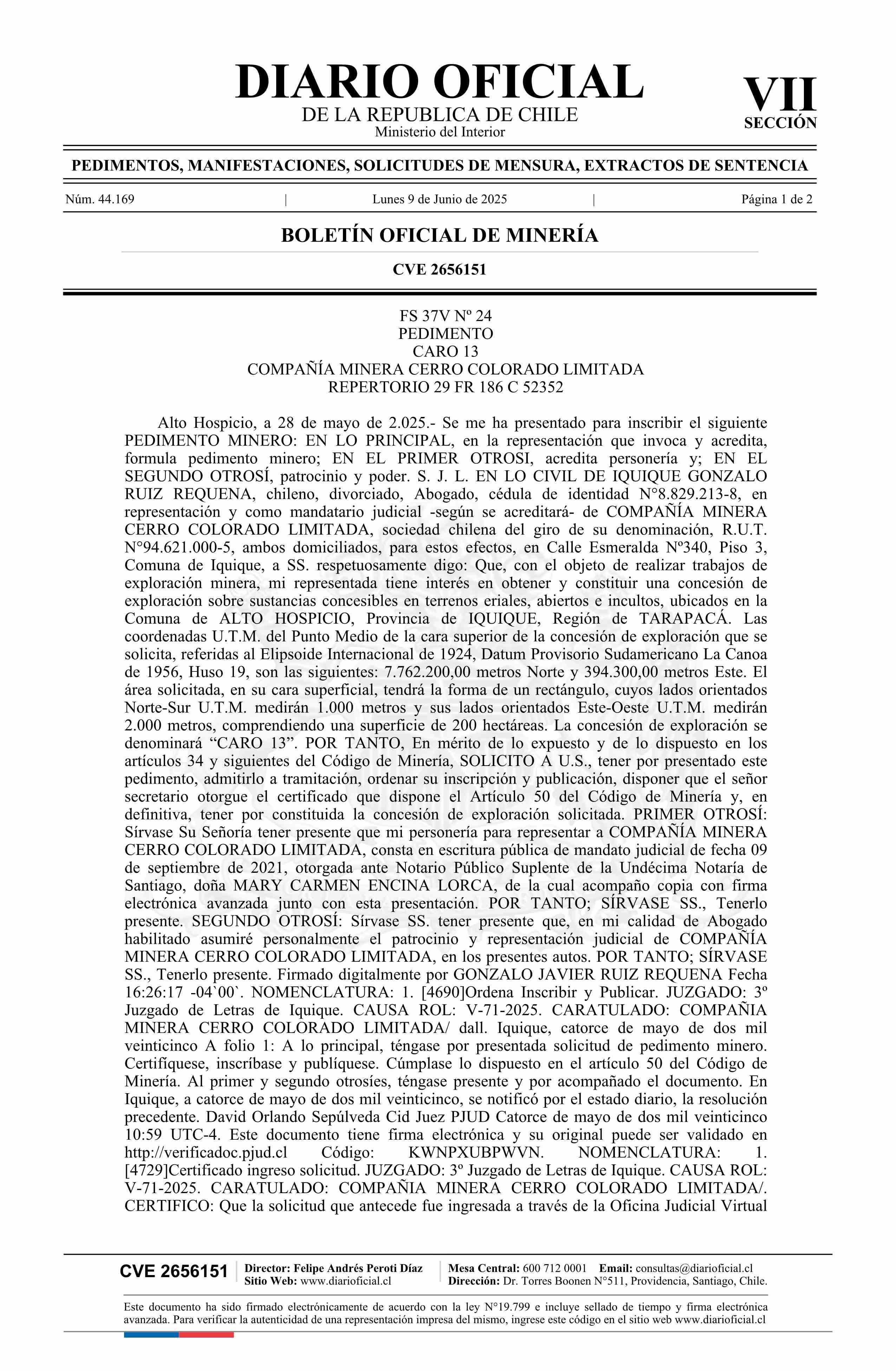 CARO 13 / Compañía Minera Cerro Colorado Limitada 09-06-2025 DIARIO OFICIAL CHILE - BOLETÍN OFICIAL DE MINERÍA |