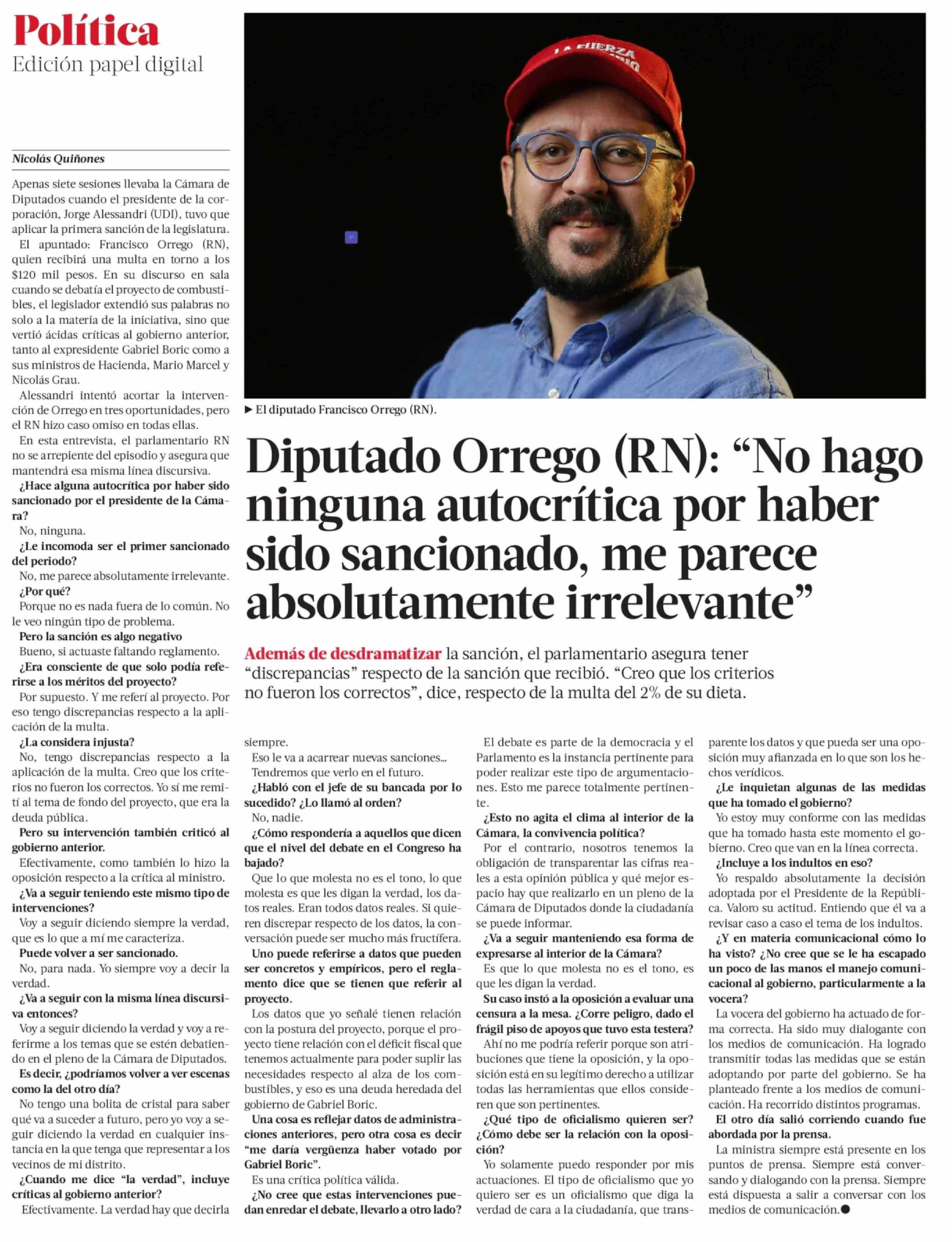 | Título: | Diputado Orrego (RN): "No hago ninguna autocrítica por haber sido sancionado, me parece absolutamente irrelevante" |