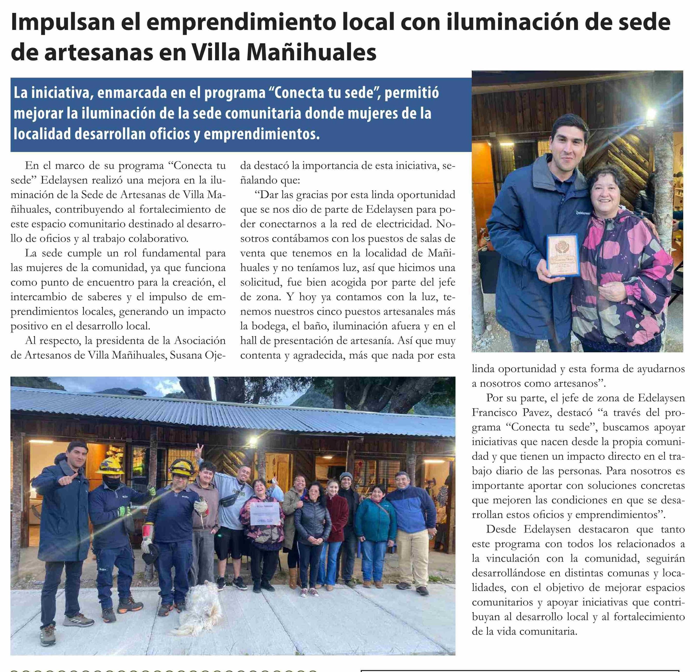 | Título: | Impulsan el emprendimiento local con iluminación de sede de artesanas en Villa Mañihuales |