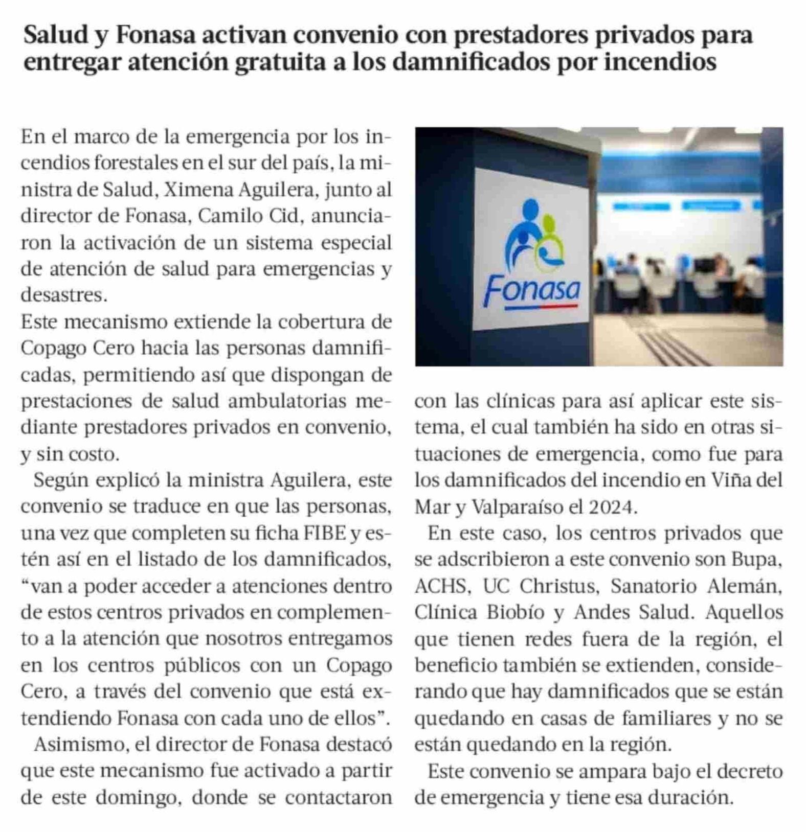 Salud y Fonasa activan convenio con prestadores privados para entregar atención gratuita a los damnificados por incendios 22-01-2026 La Tercera |