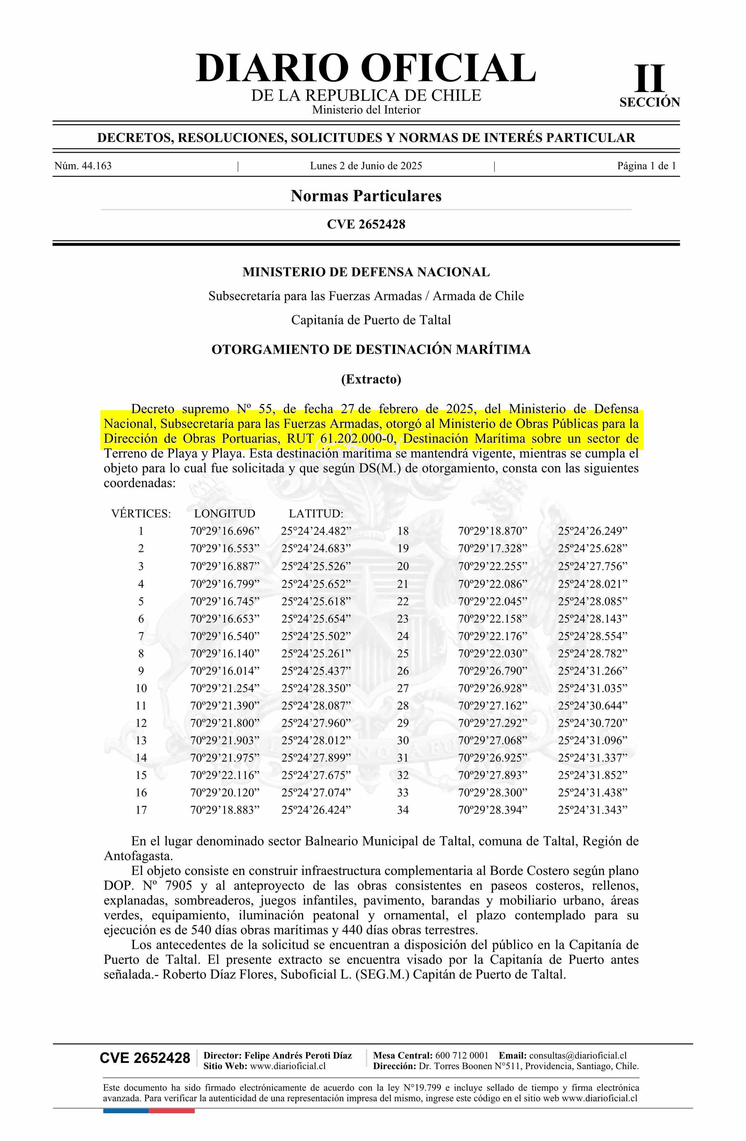 Extracto de decreto número 55, de 2025.- Otorgamiento de destinación marítima 02-06-2025 Diario Oficial Edición Electrónica |