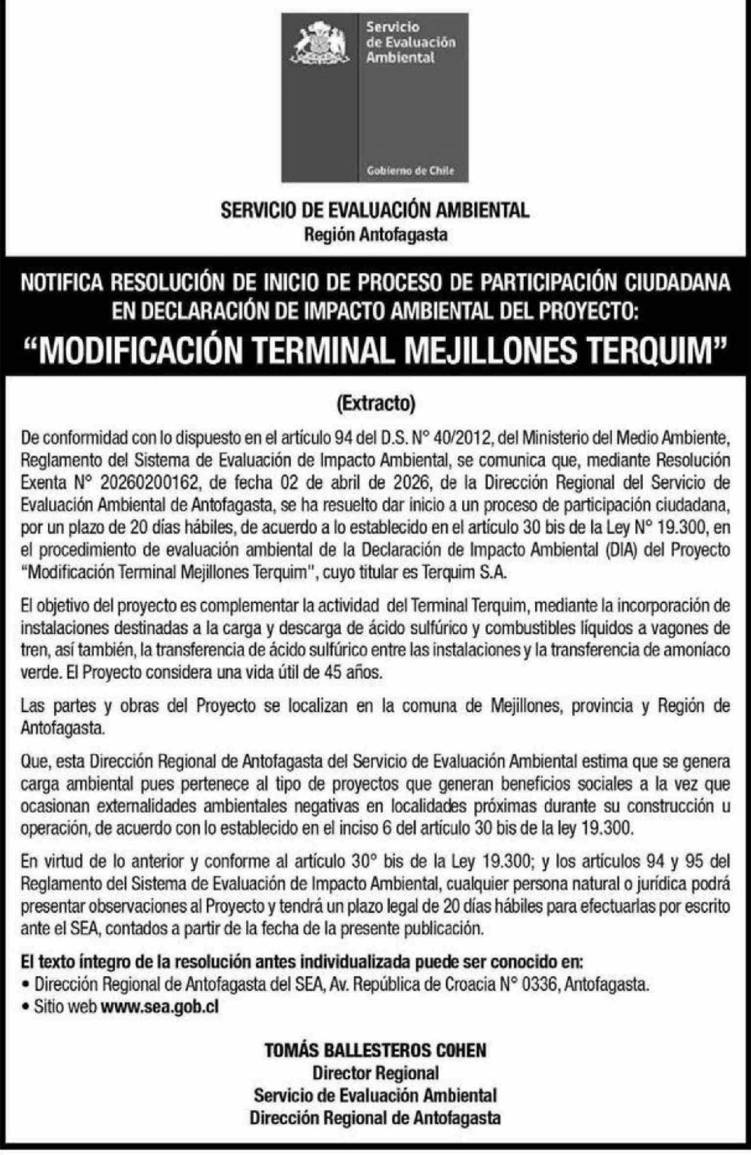 Extractos: Servicio de Evaluación Ambiental 16-04-2026 La Estrella de Antofagasta |