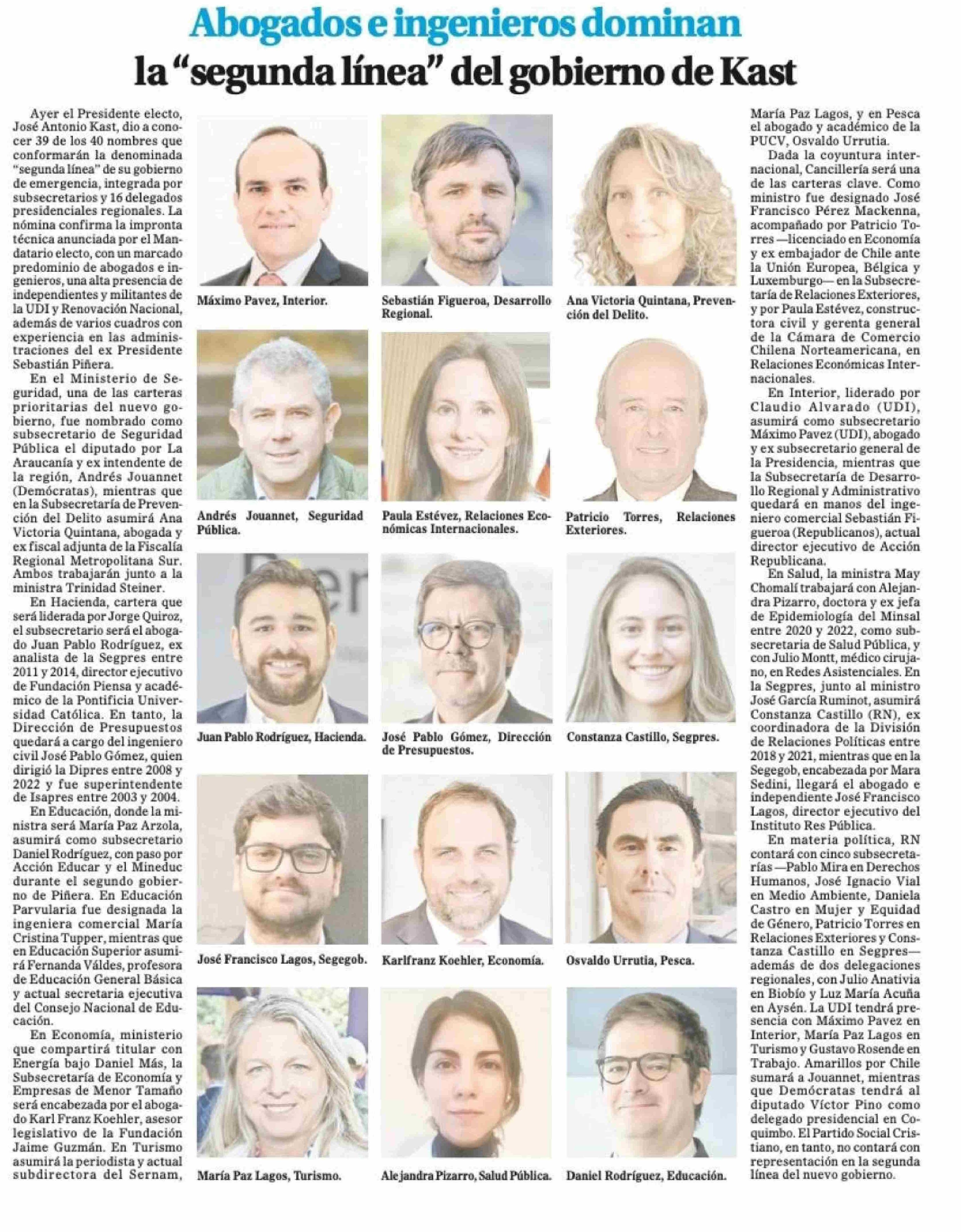 Título: Abogados e ingenieros dominan la "segunda línea" del gobierno de Kast