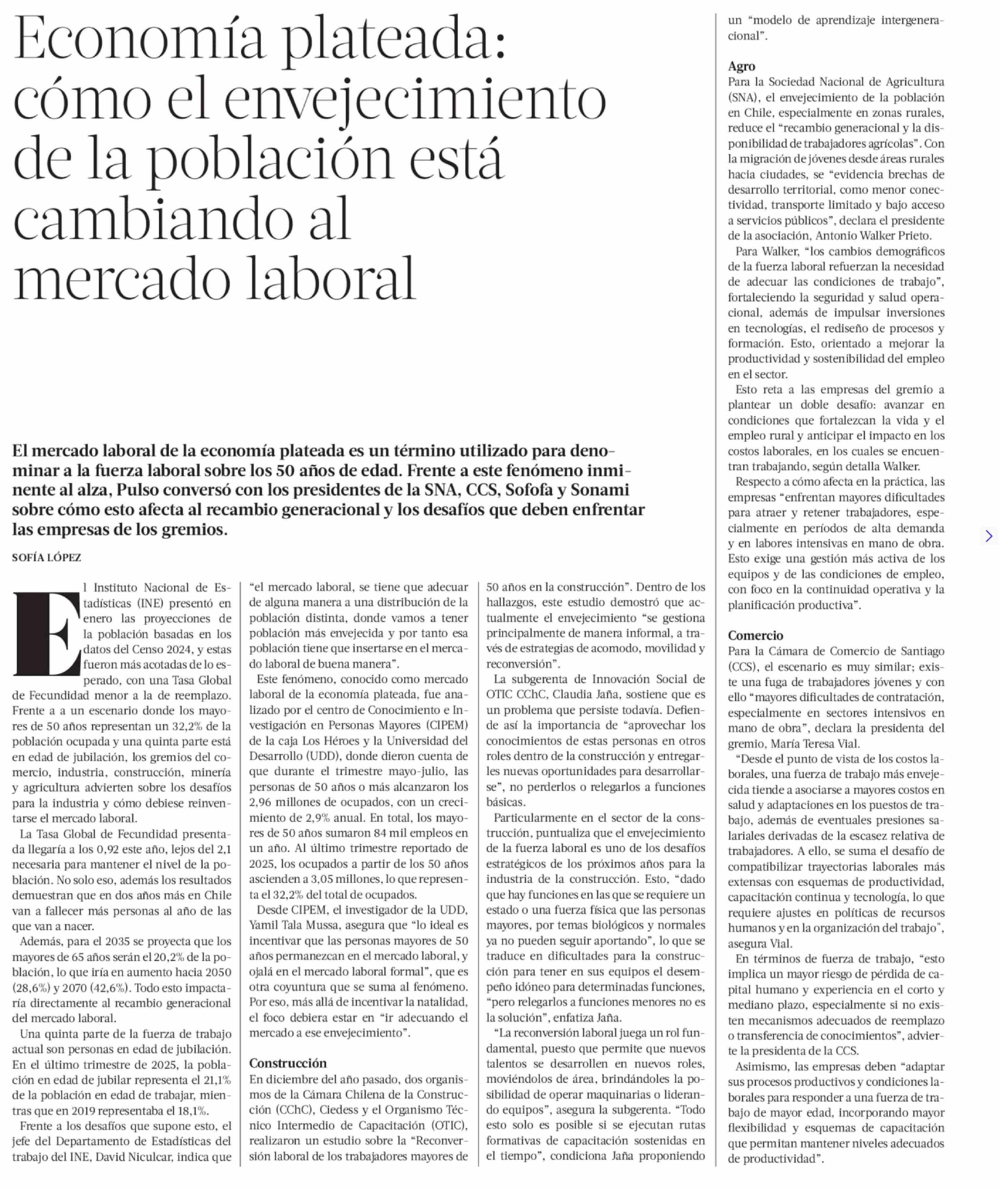 Economía plateada: cómo el envejecimiento de la población está cambiando al mercado laboral 14-02-2026 La Tercera |