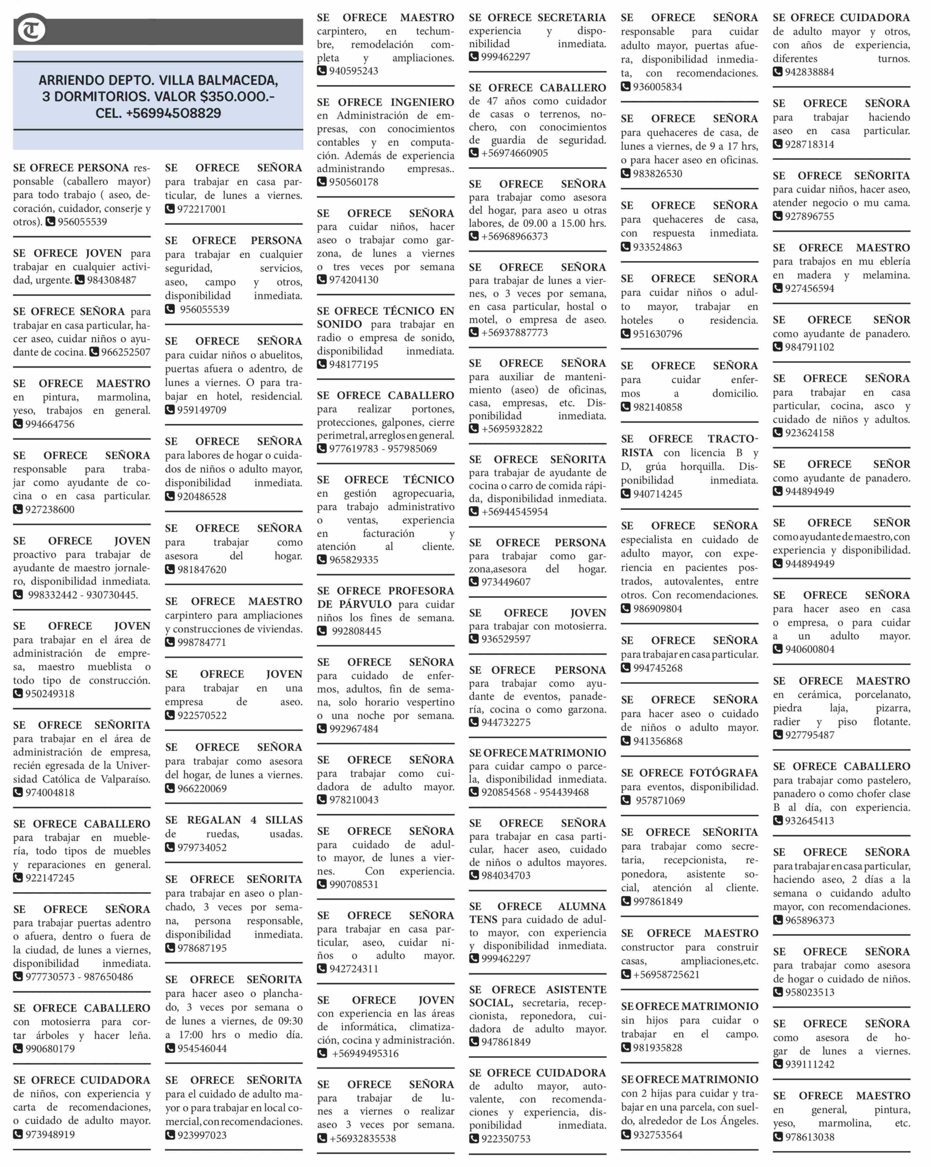 SE OFRECE PERSONA responsable (caballero mayor) para todo trabajo ( aseo, decoración, cuidador, conserje y otros). 956055539 24-01-2026 La Tribuna |