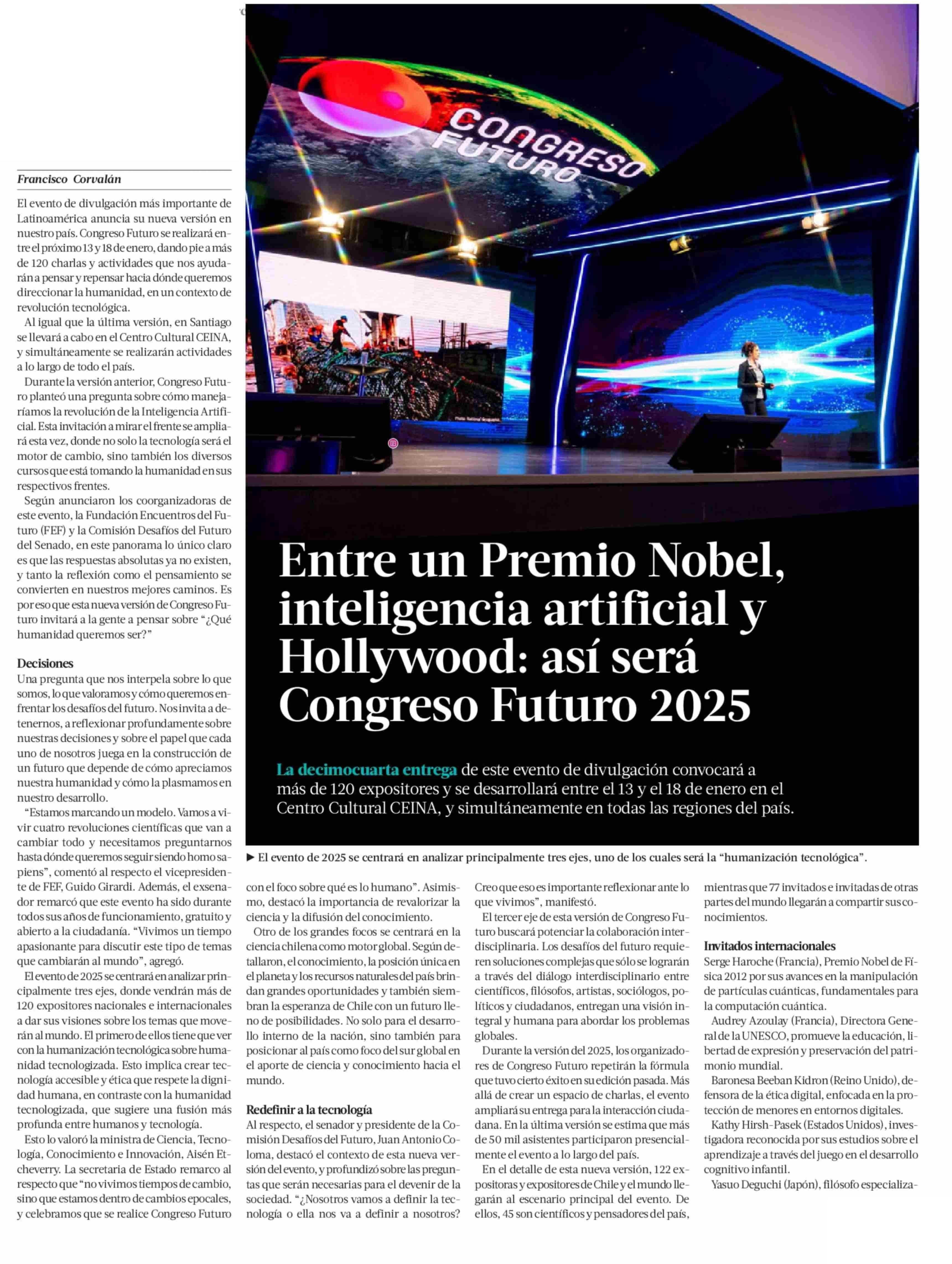 Entre un Premio Nobel, inteligencia artificial y Hollywood: así será Congreso Futuro 2025 03-12-2024 La Tercera |