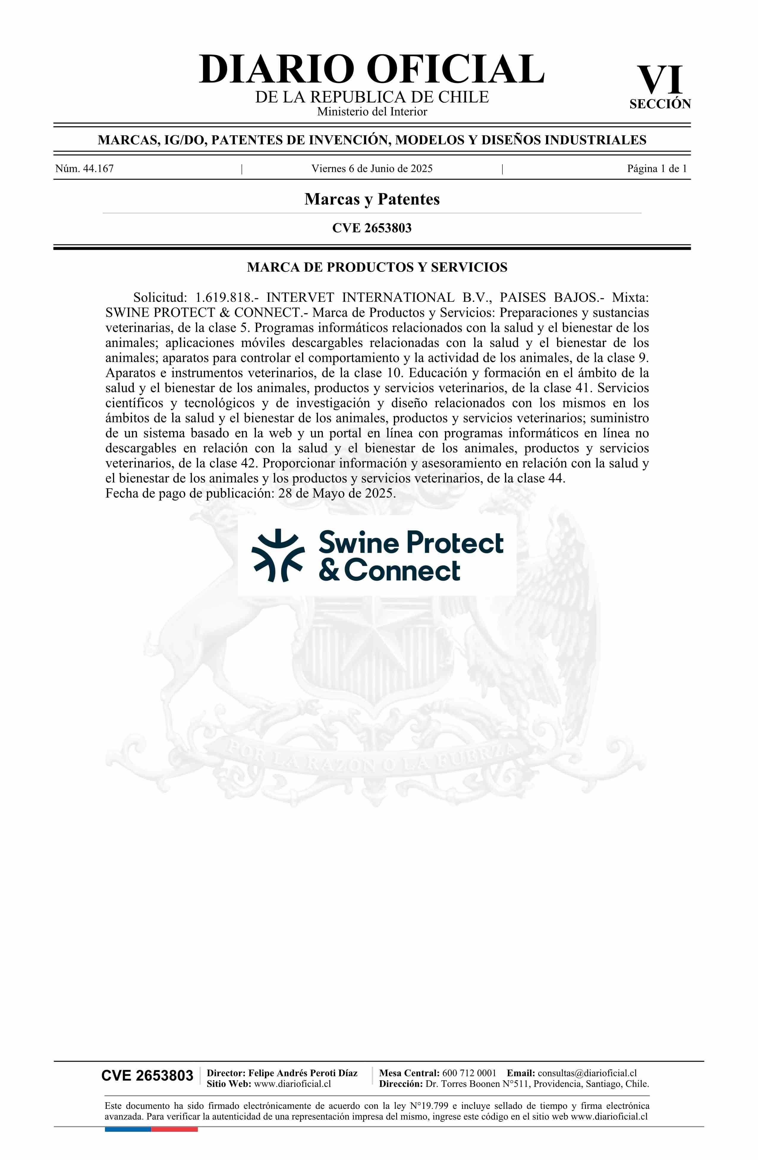 Solicitud número 1619818.- SWINE PROTECT & CONNECT 06-06-2025 Diario Oficial Edición Electrónica |