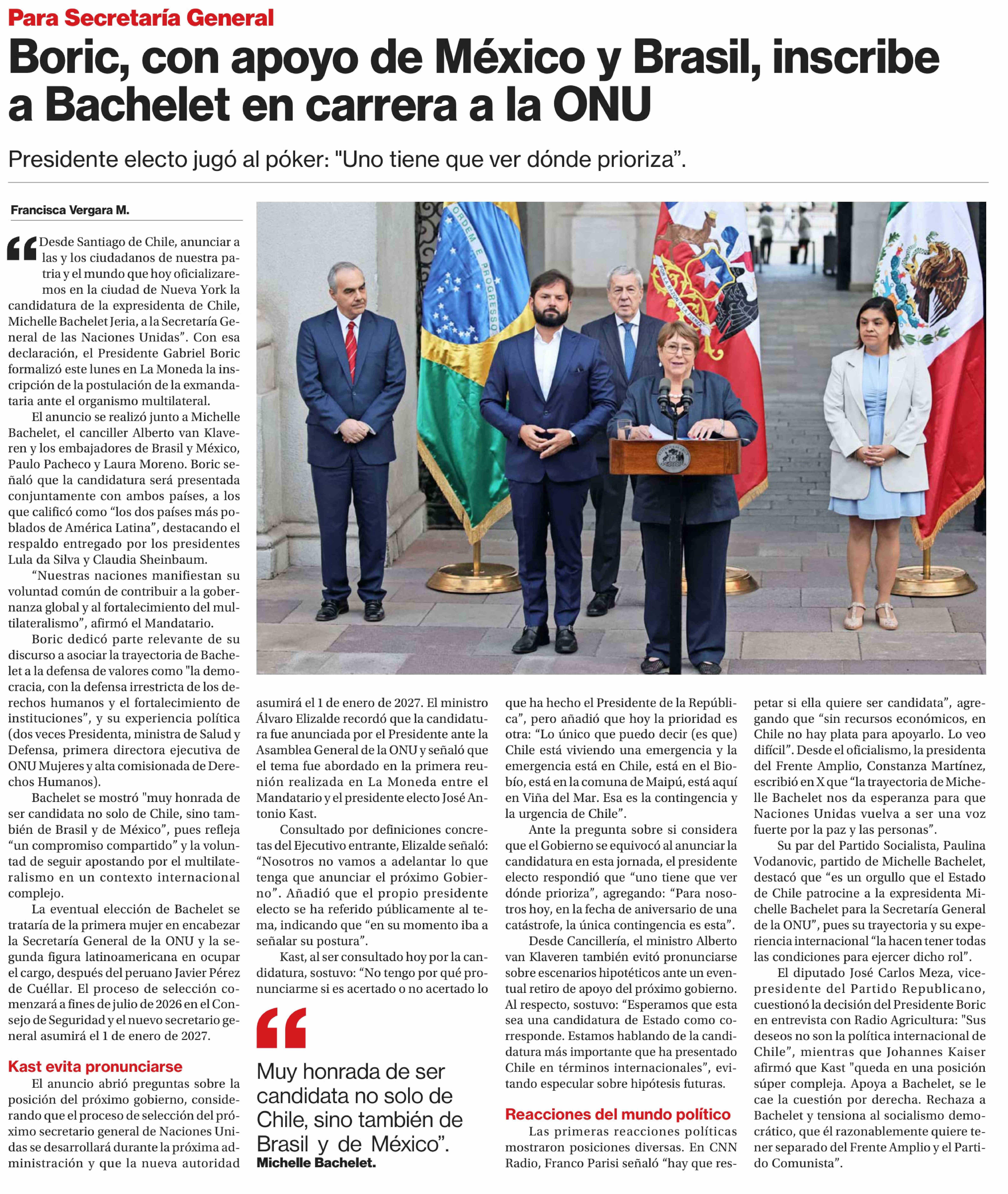 Boric, con apoyo de México y Brasil, inscribe a Bachelet en carrera a la ONU 02-02-2026 La Segunda |