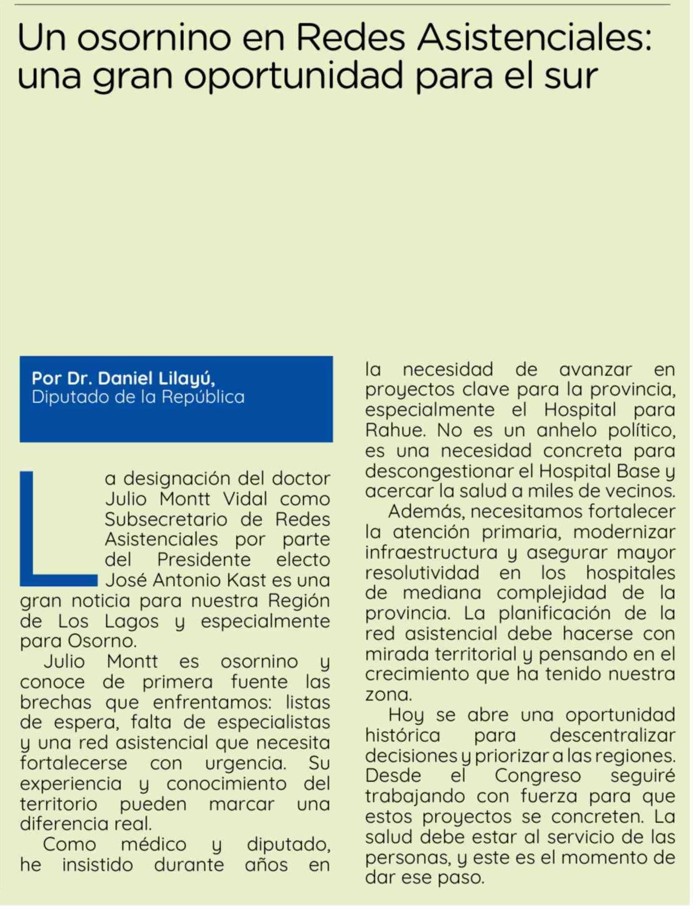 Columnas de Opinión: Un osornino en Redes Asistenciales: una gran oportunidad para el sur 24-02-2026 El Insular |