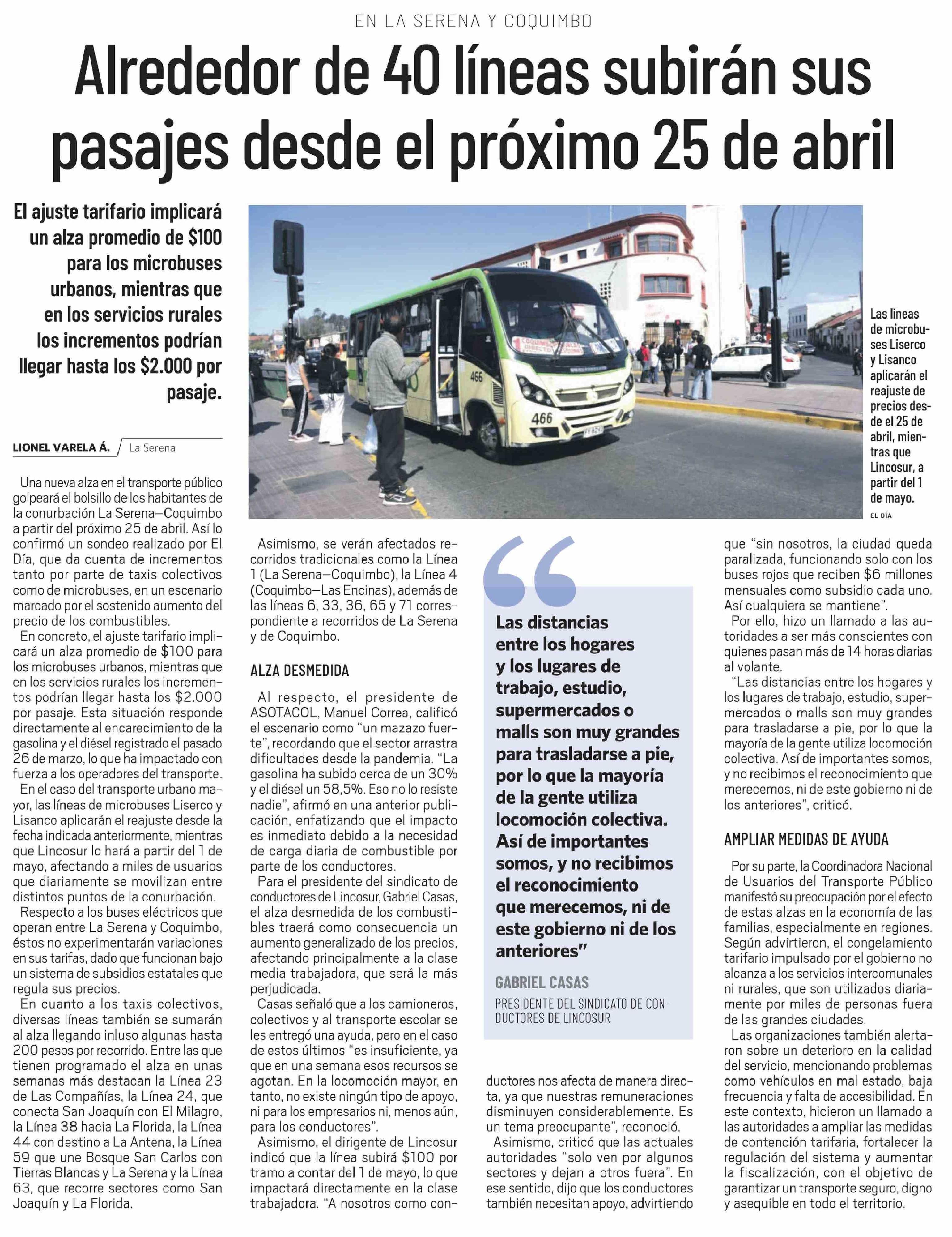 | Título: | Alrededor de 40 líneas subirán sus pasajes desde el próximo 25 de abril |