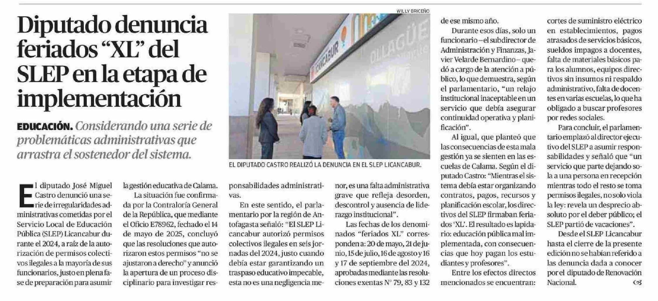 Título: Diputado denuncia feriados “XL” del SLEP en la etapa de implementación