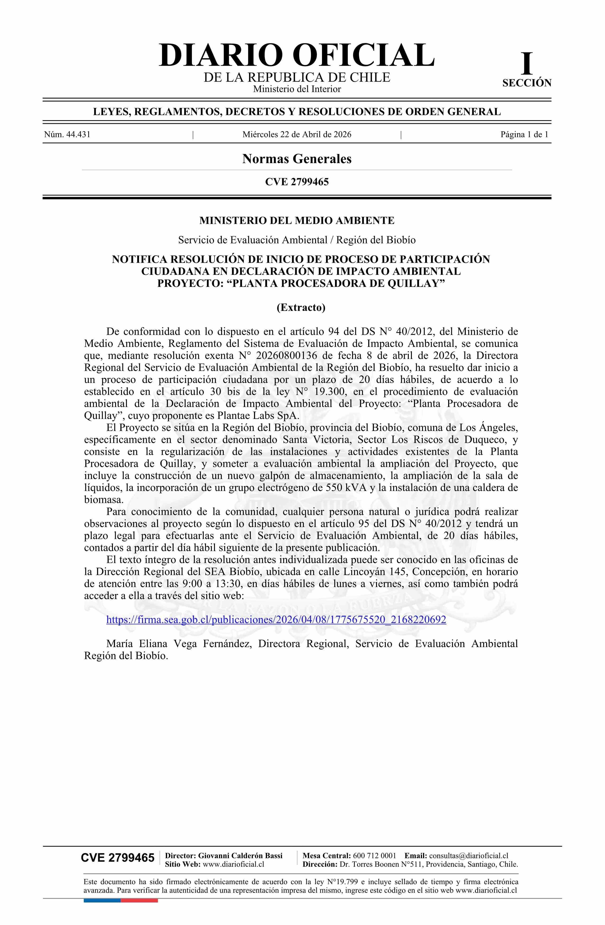 Extracto de resolución exenta número 20260800136, de 2026.- Inicia proceso de participación ciudadana en Declaración de Impacto Ambiental proyecto: Planta Procesadora de Quillay 22-04-2026 Diario Oficial Edición Electrónica |