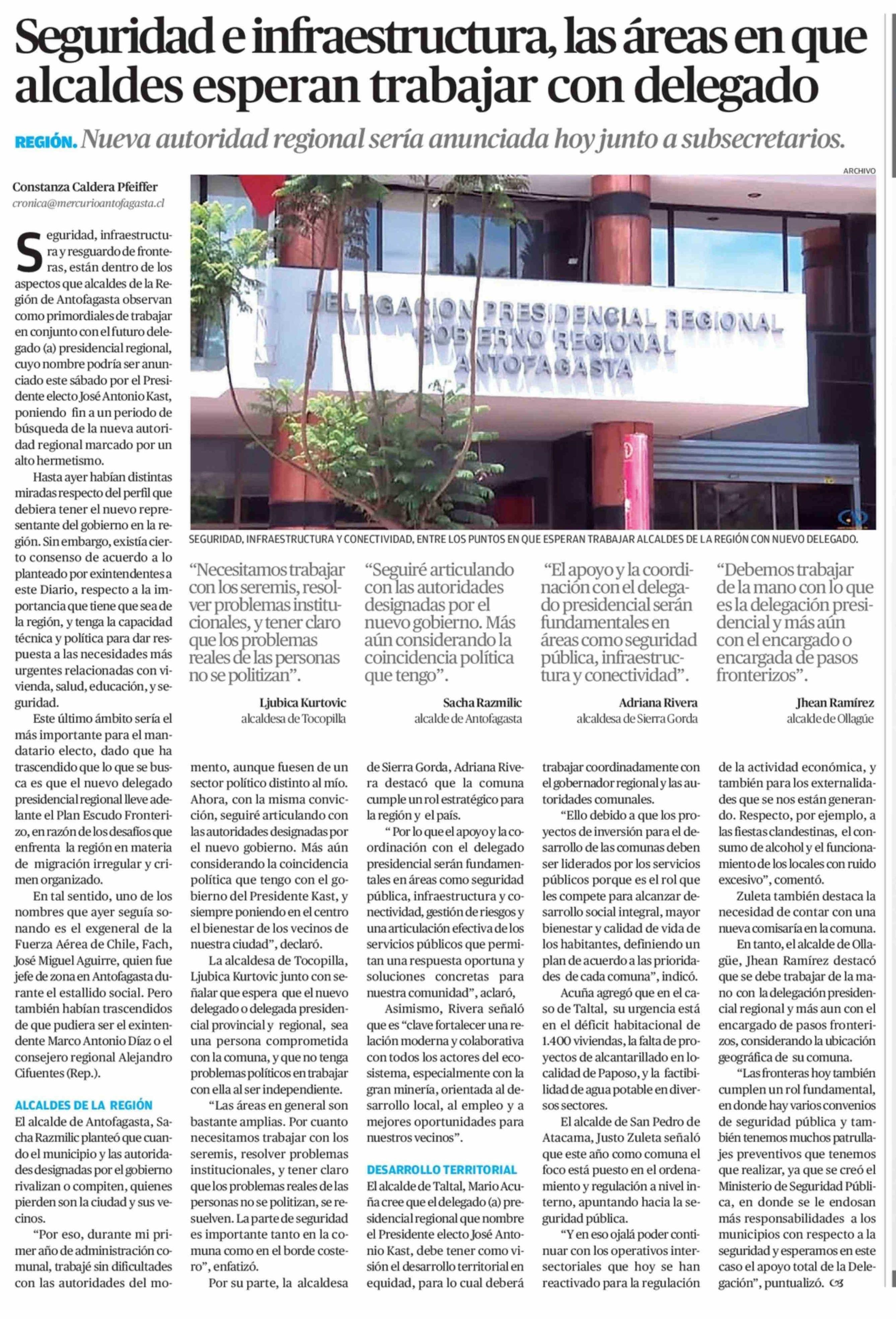 Seguridad e infraestructura, las áreas en que alcaldes esperan trabajar con delegado 07-02-2026 El Mercurio de Antofagasta |